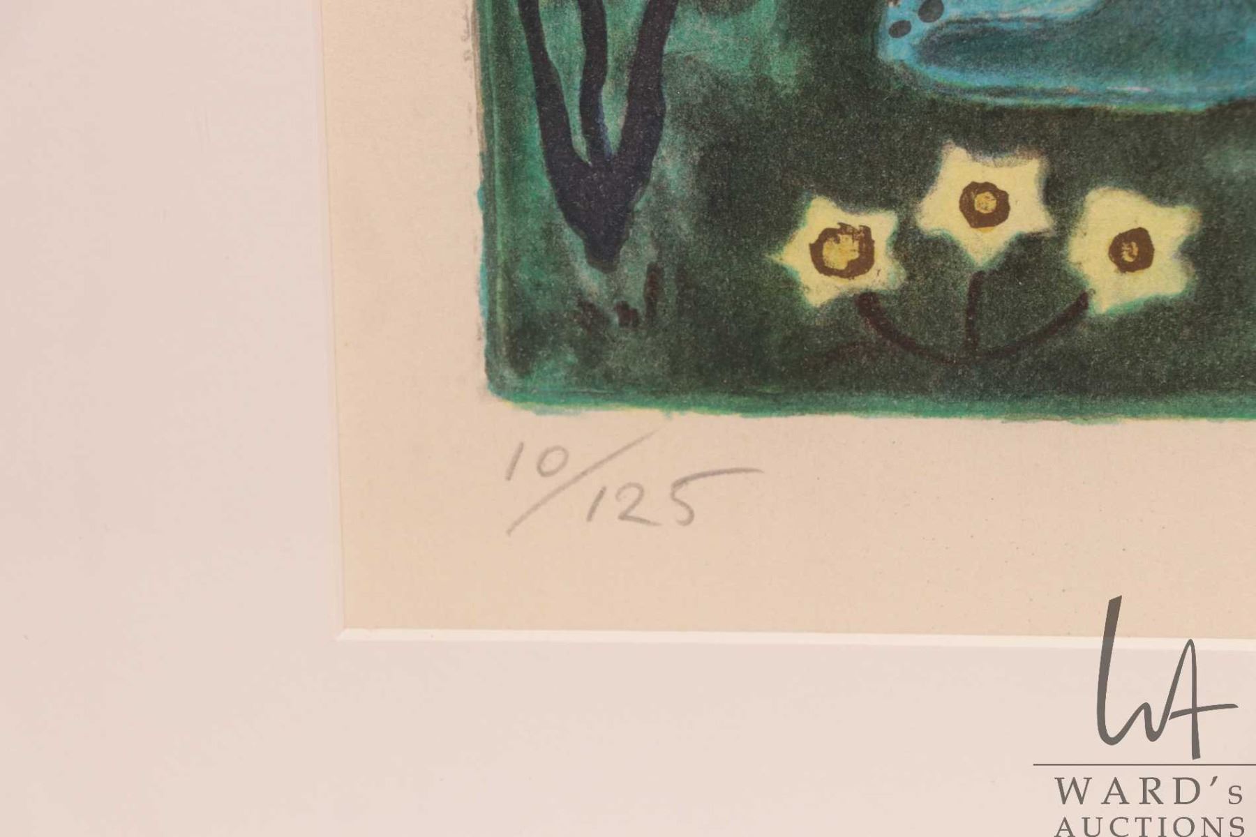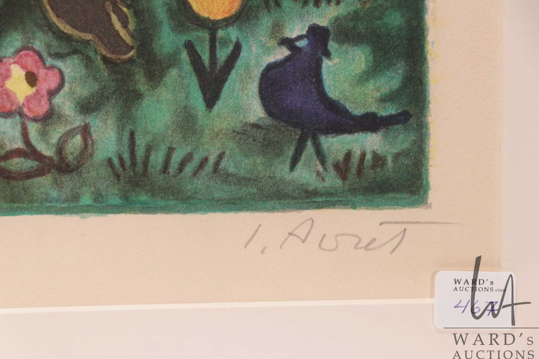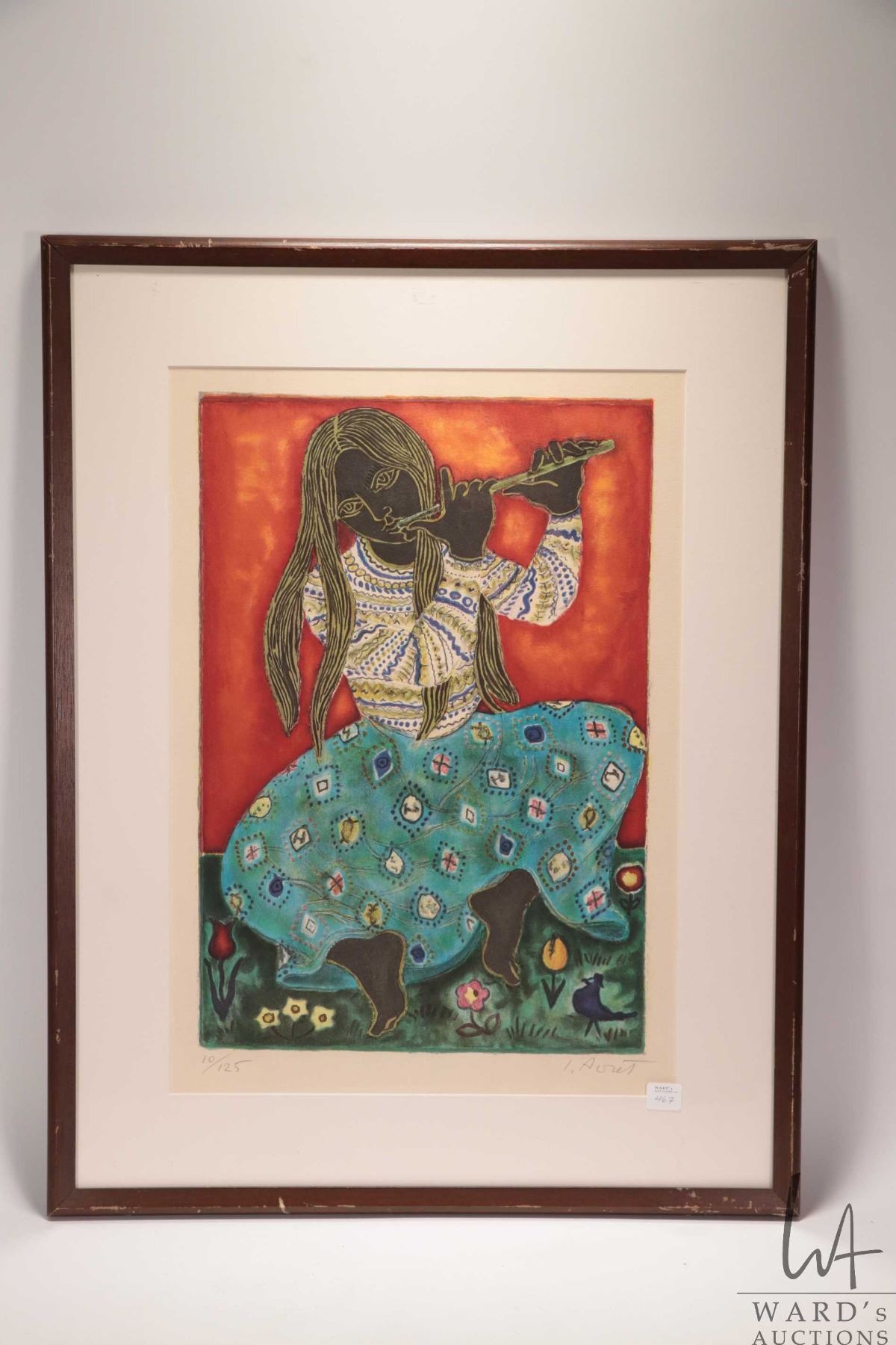 Irene Awret limited edition lithograph, titled "Girl with a Flute", pencil signed by artist 10/25. Overall dimensions including frame 27 1/2" X 21 1/2". Note: This is too large to ship. Local pickup only