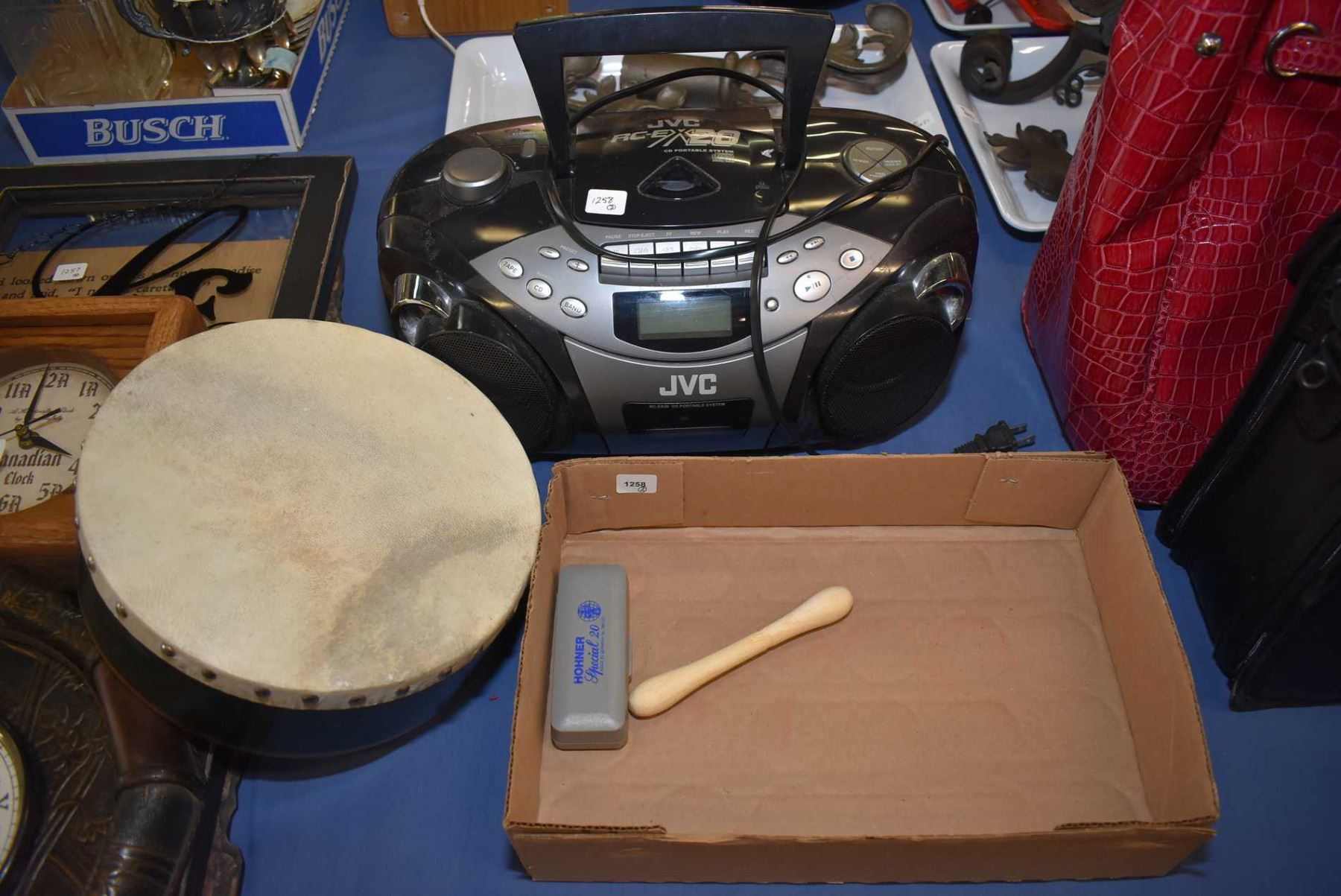JVC portable stereo, a hand drum and Honer harmonica