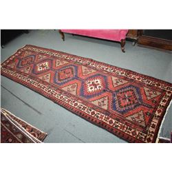 100% handmade wool carpet runner Savah with triple medallion, red background and highlights of cream, blue etc. 38" X 115"