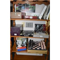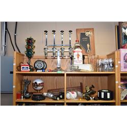 Two shelf lots of collectible bar decor including bottle dispenser, stop light and Coor's lamps, tir