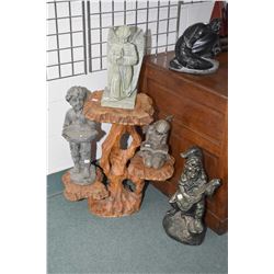 Hand carved three tier wooden plant stand and a selection garden figures including fairy, an angel,