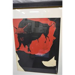 Framed original watercolour abstract signed by artist Hall '84, 30" X 22" and a framed two colour block print of a bull signed Eisert ...