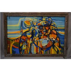 Framed original acrylic on canvas painting of an Inuit dog sled and Northern lights signed by artist