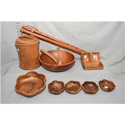 Wood salad set including bowl and four dishes, tableside salad dish with servers plus a wooden lined ice bucket etc.