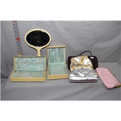 Five vintage purses plus three pieces of French ivory including glove box, dresser box and hand mirr