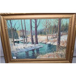 Framed oil on board painting of a wooded creek in winter, no artist signature seen 13" X 18"
