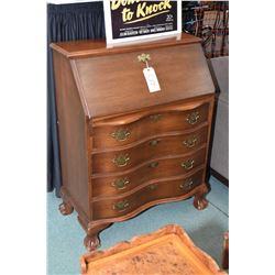 Mid 20th century mahogany drop front bureau with four serpentine drawers, fitted interior and ball and claw feet