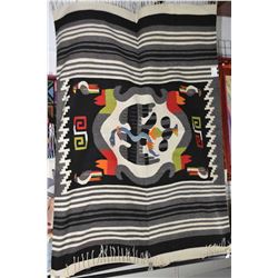 Woven wool blanket with First Nations motif including center medallion featuring a eagle and snake plus birds in grays, blacks, reds, orange and green