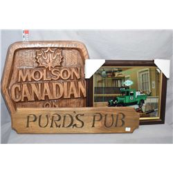 Four pub signs including "Purd's Pub" , "Molson Canadian on draught" and two Atlas 60 framed mirrors