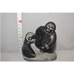 Large hand carved soapstone of a hunter with his catch, 10 1/2" in height