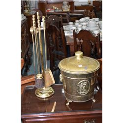 Antique brass coal hod with claw feet and bass relief figure and a vintage brass companion set