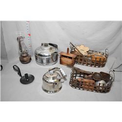 Selection of primitive and collectibles kitchenware including two kettles, wooden and metal spoons a
