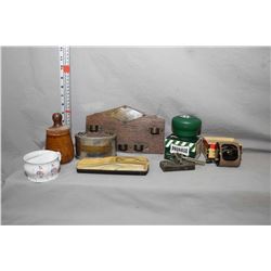 Selection of men's collectible shaving items including moustache mug and brush, razor holder, razor
