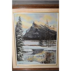 Framed oil on canvas painting of a wintry mountain scene by Alberta artist Mathew Wong, 20" X 16"