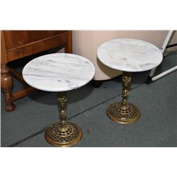 Pair of brass center pedestal marble top wine tables