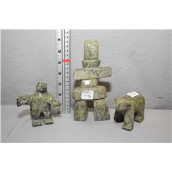 Three light green soapstone carvings including standing bear 4" in height, standing bear purportedly