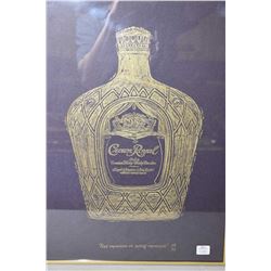 Five framed bar decor pictures including limited edition Crown Royal picture 158/500, Christmas Crow