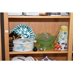 This item is not available for shipping. Local pickup only. Shelf lot of collectibles including lidded hand painted pottery casserole dish, juice jug,