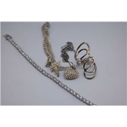 Selection of sterling silver jewellery including diamante tennis bracelet and heart shaped pendant o