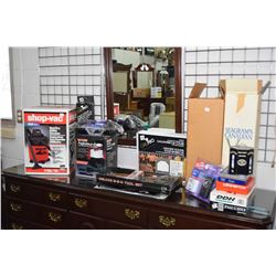 Selection of new in box items including Shopvac wet/dry utility vacuum, Motor Master car vacuum, Del