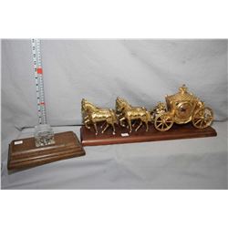 Antique oak desk top pen holder with glass inkwell and a vintage carriage and horse clock