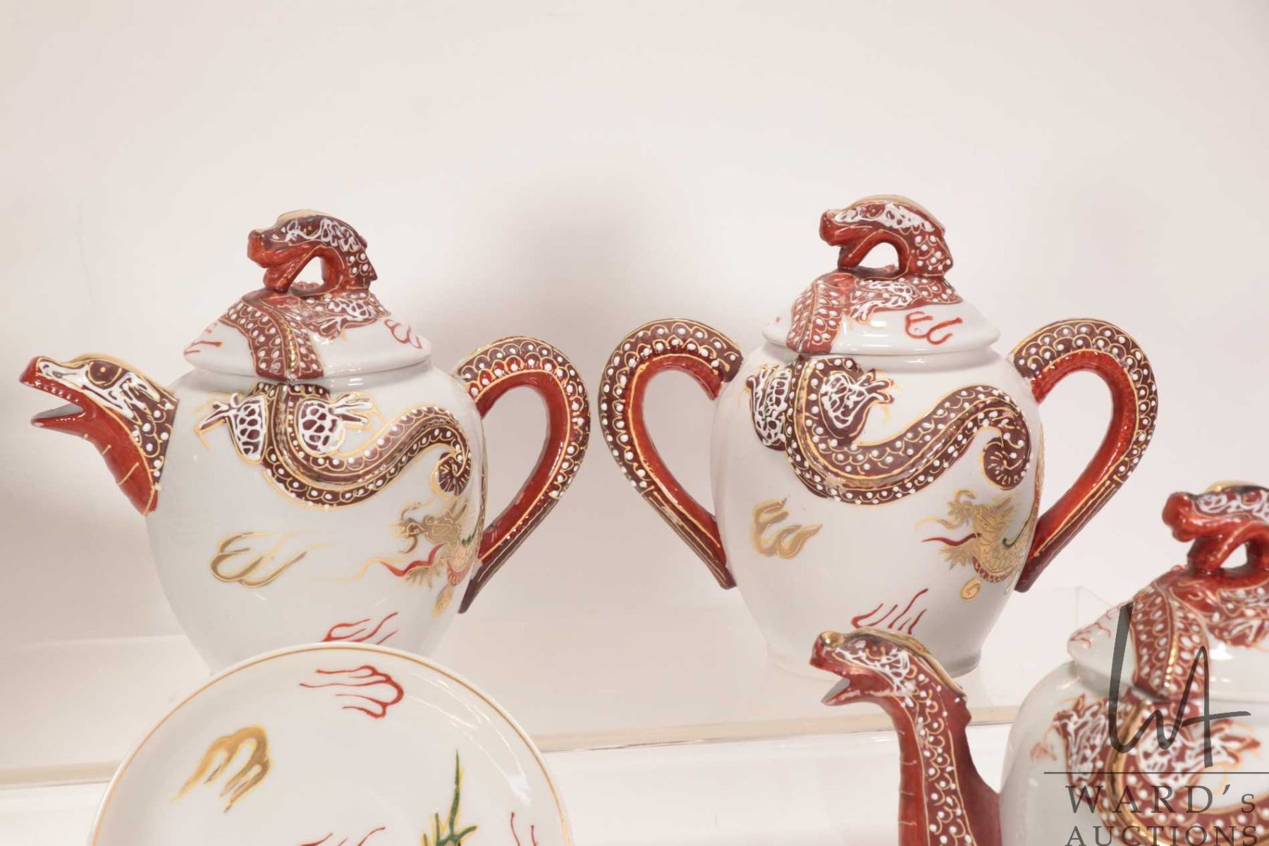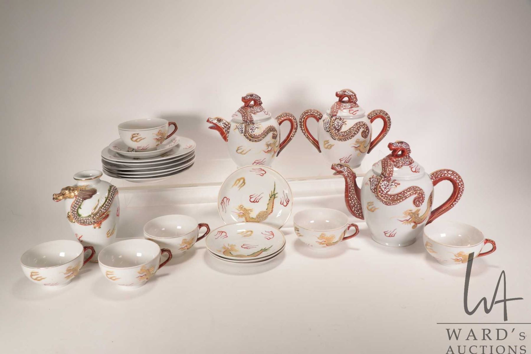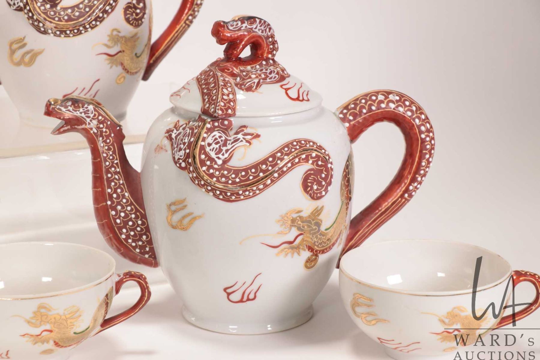 Japanese "Dragonware" Kutani porcelain tea set with moriage beaded detailing and lithopane Geisha in