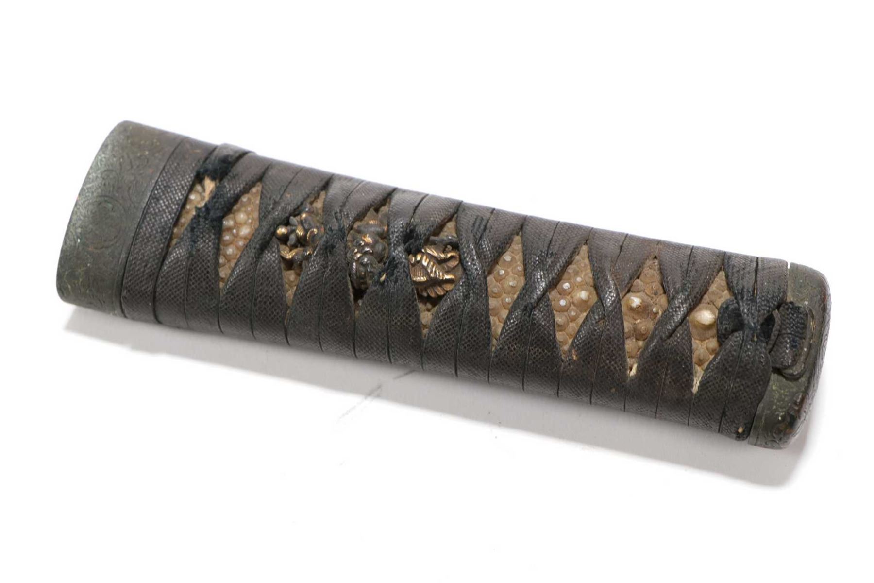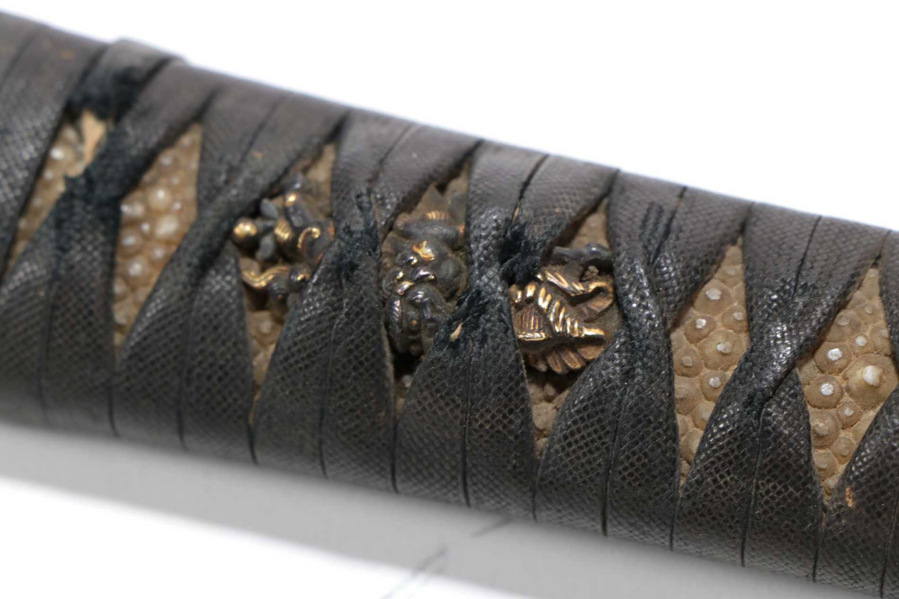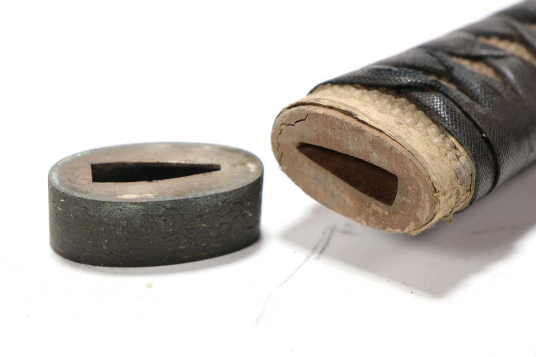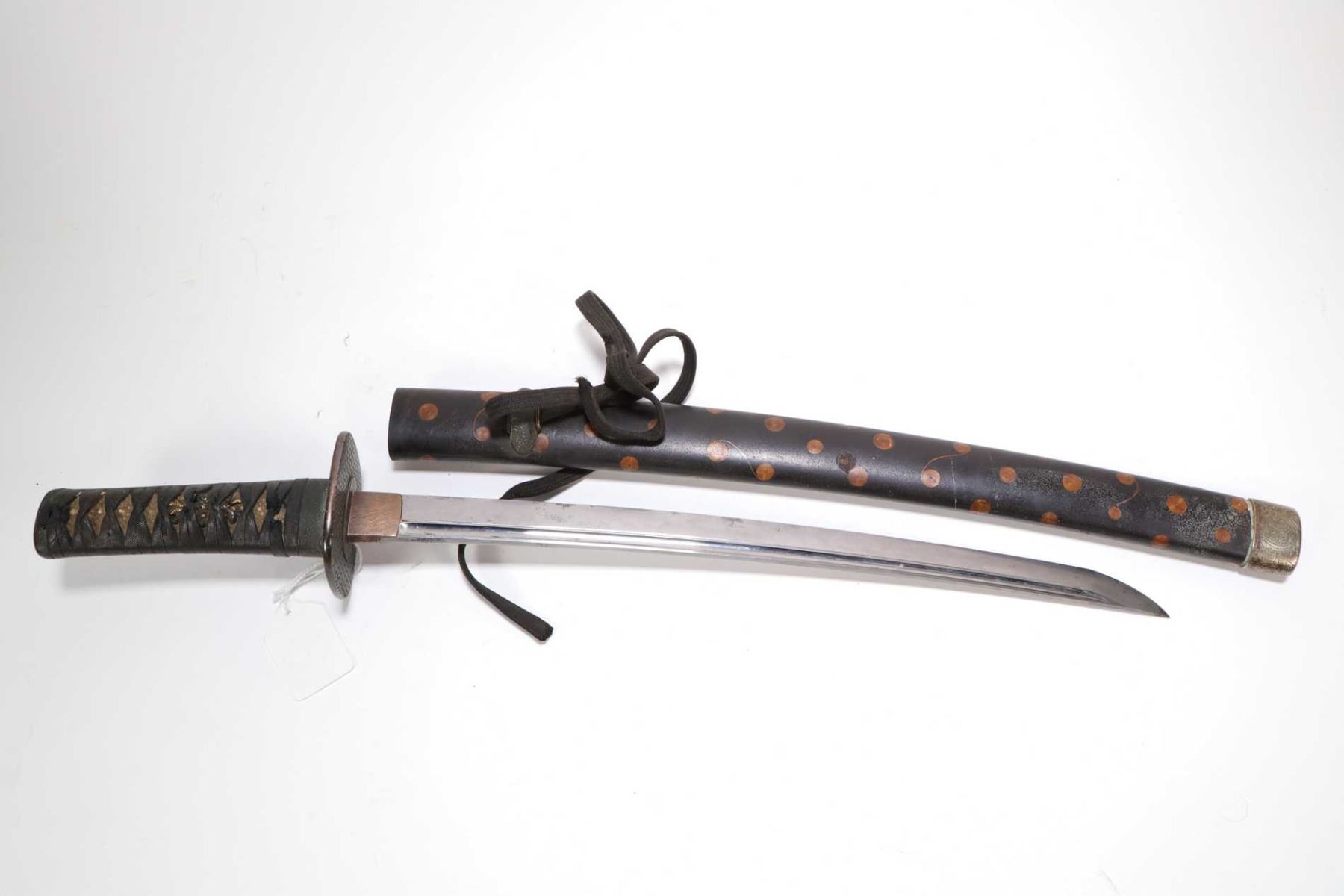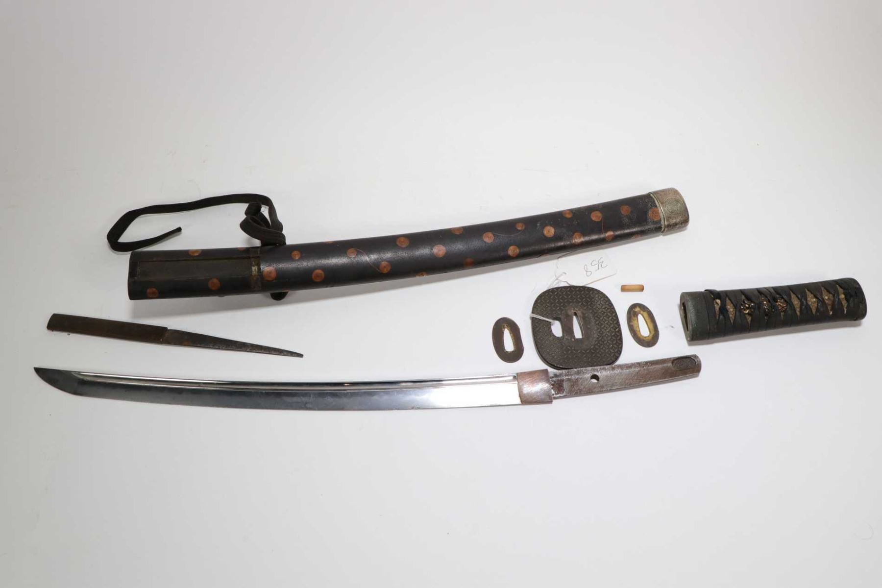 Japanese Wakizashi with 14" blade, note minor nicks to edge and faded tempered line, signature underneath original leather wrapped grip, metal guard with two spacers, wooden Saya with wrapped purportedly manta ray skin inlaid with bronze, some pieces missing and a silver end cap, plus a small companion knife