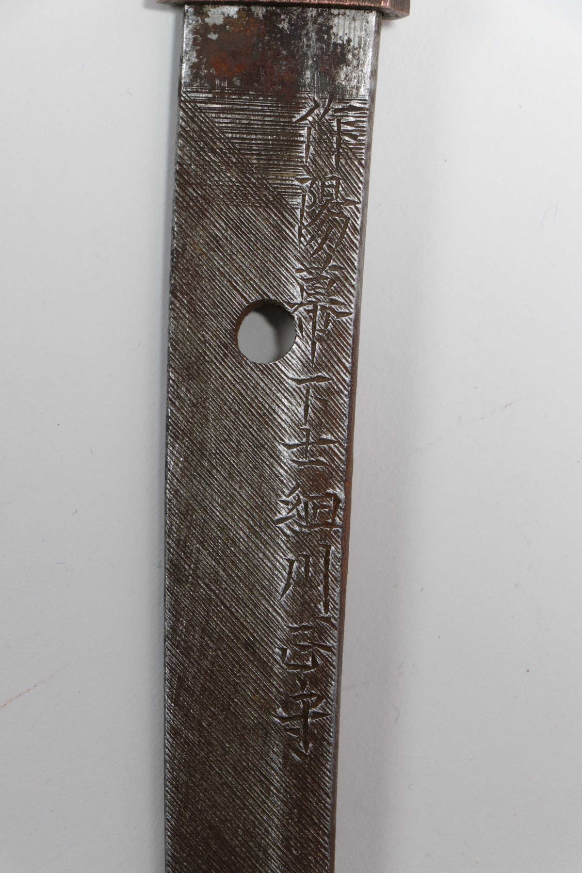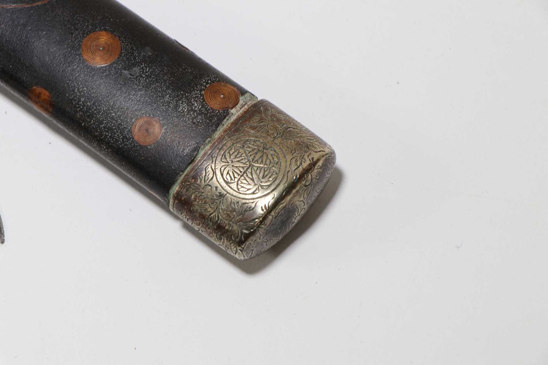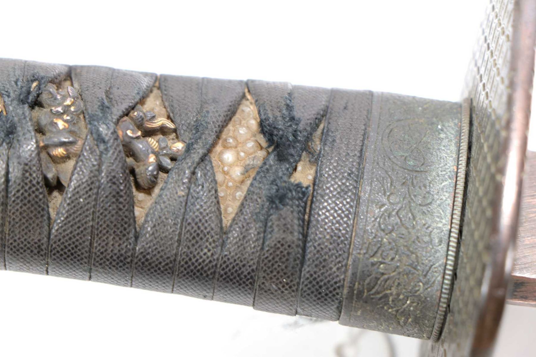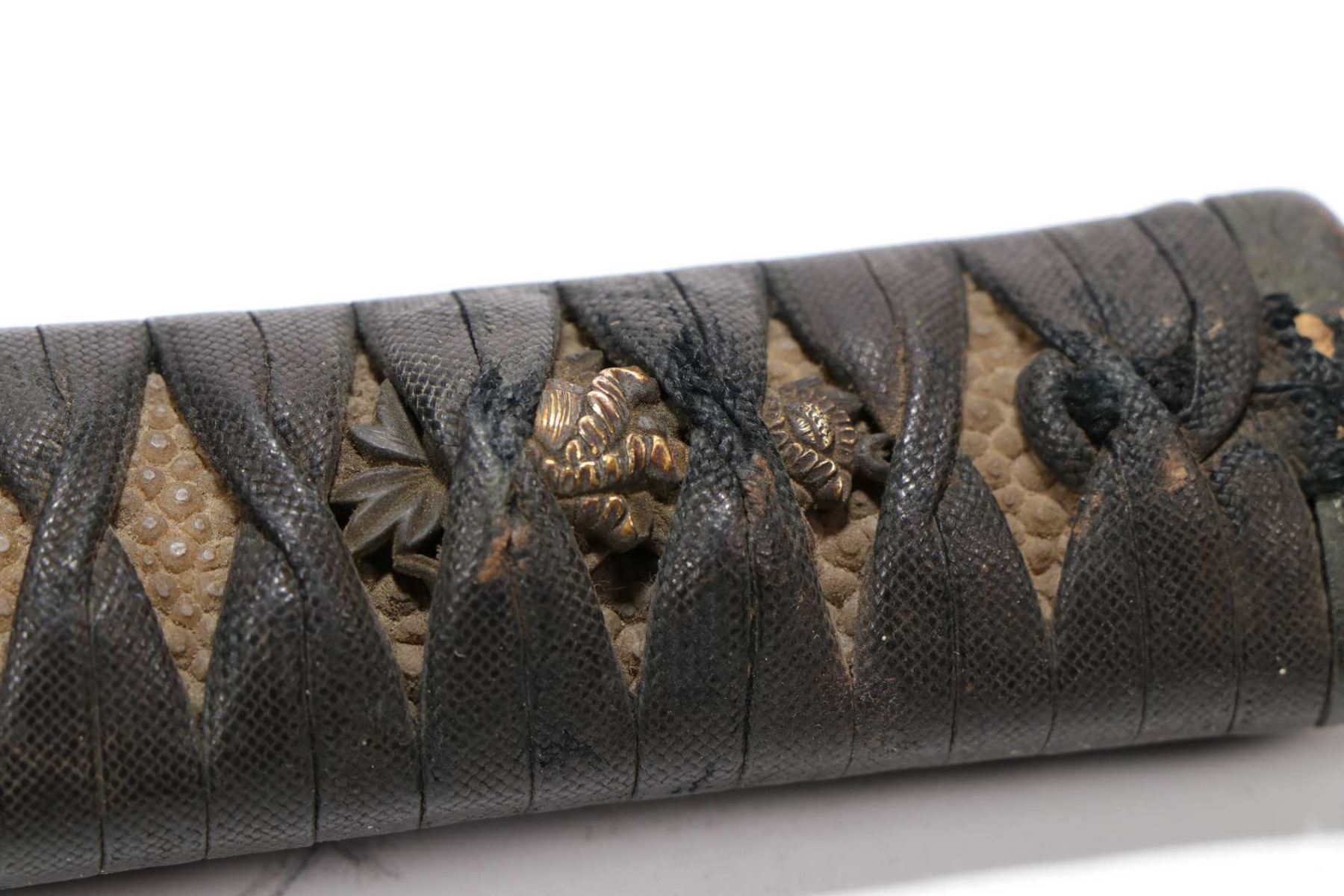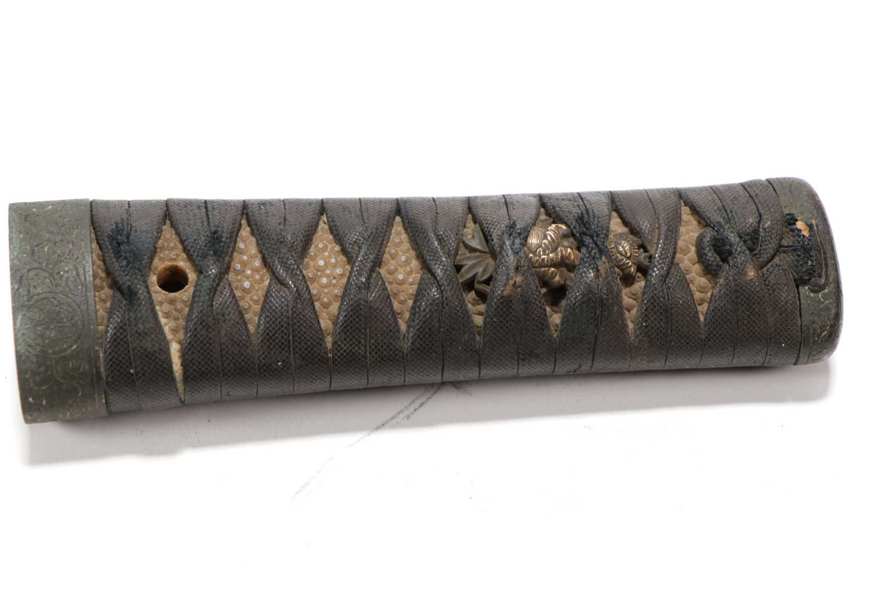 Japanese Wakizashi with 14" blade, note minor nicks to edge and faded tempered line, signature underneath original leather wrapped grip, metal guard with two spacers, wooden Saya with wrapped purportedly manta ray skin inlaid with bronze, some pieces missing and a silver end cap, plus a small companion knife