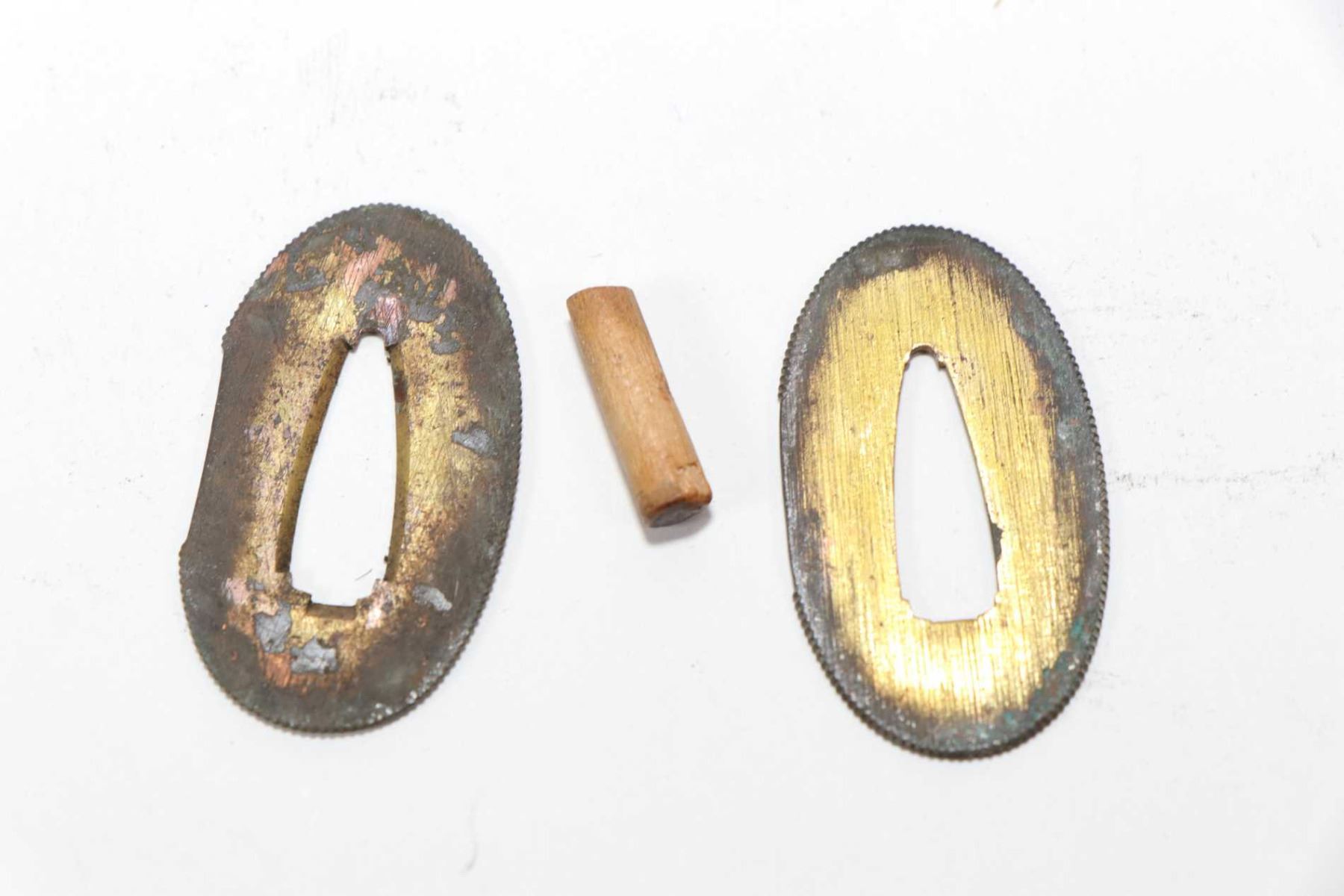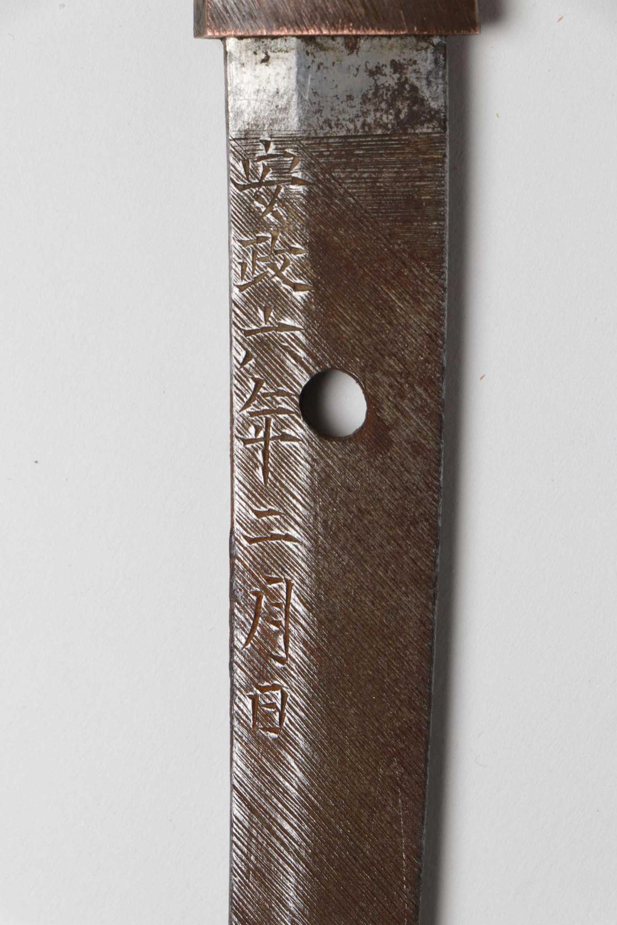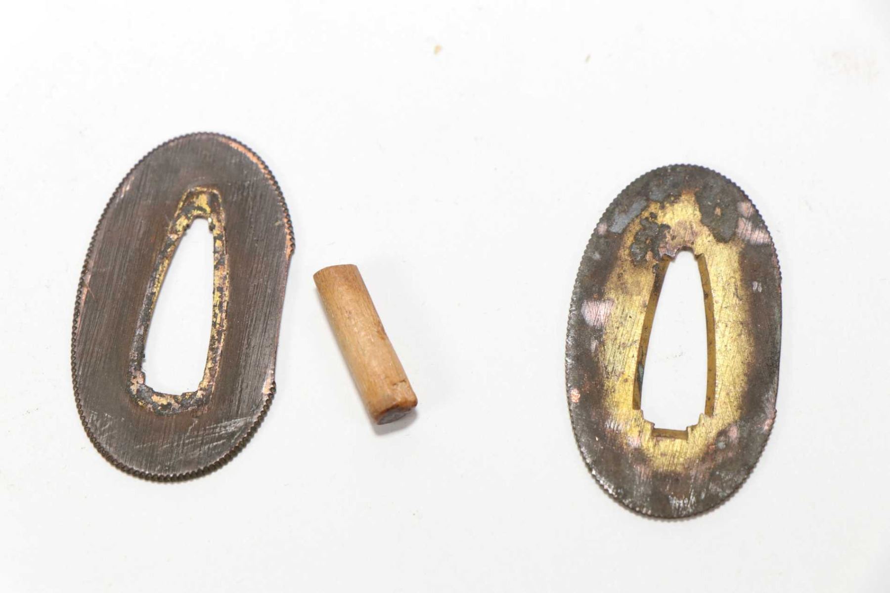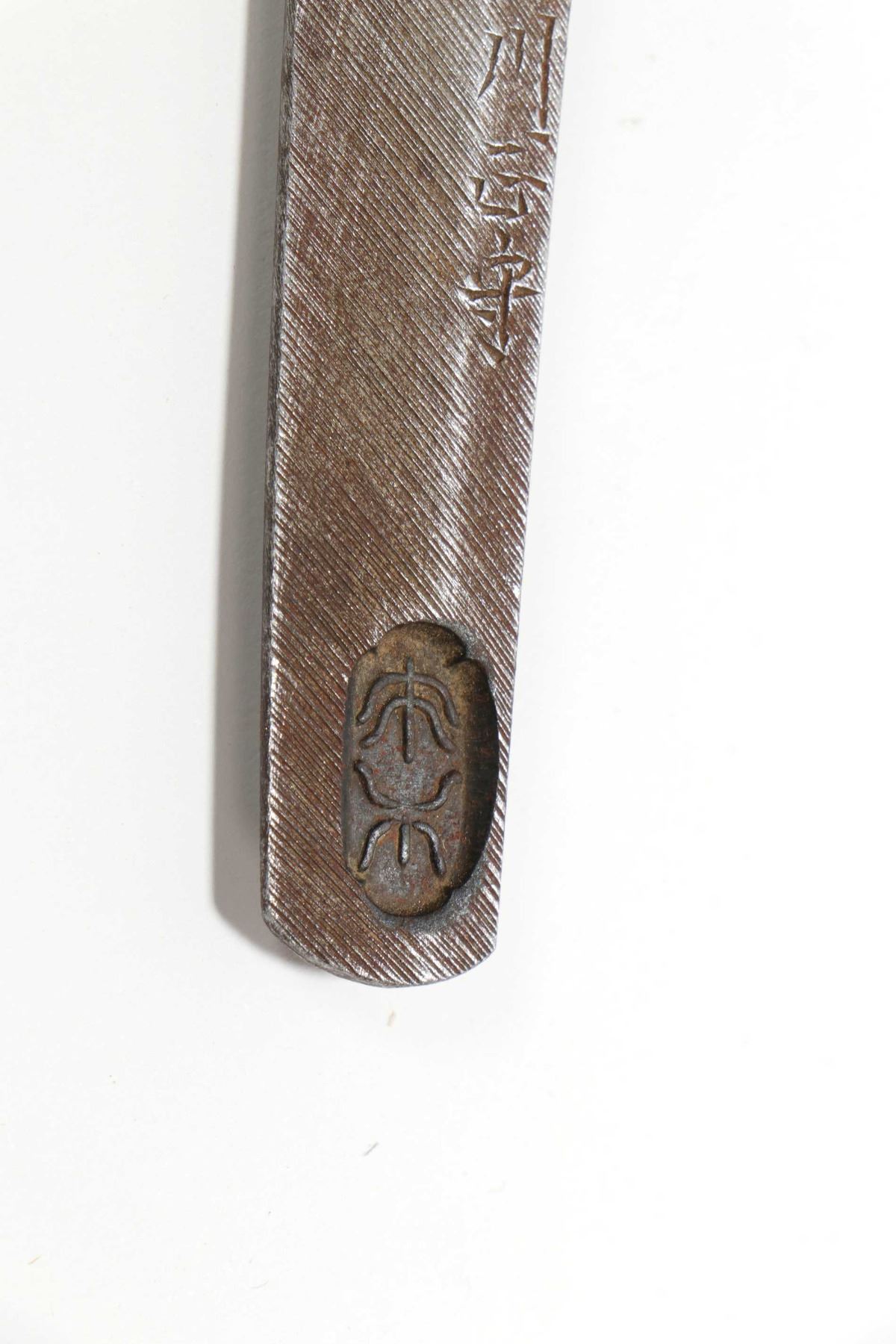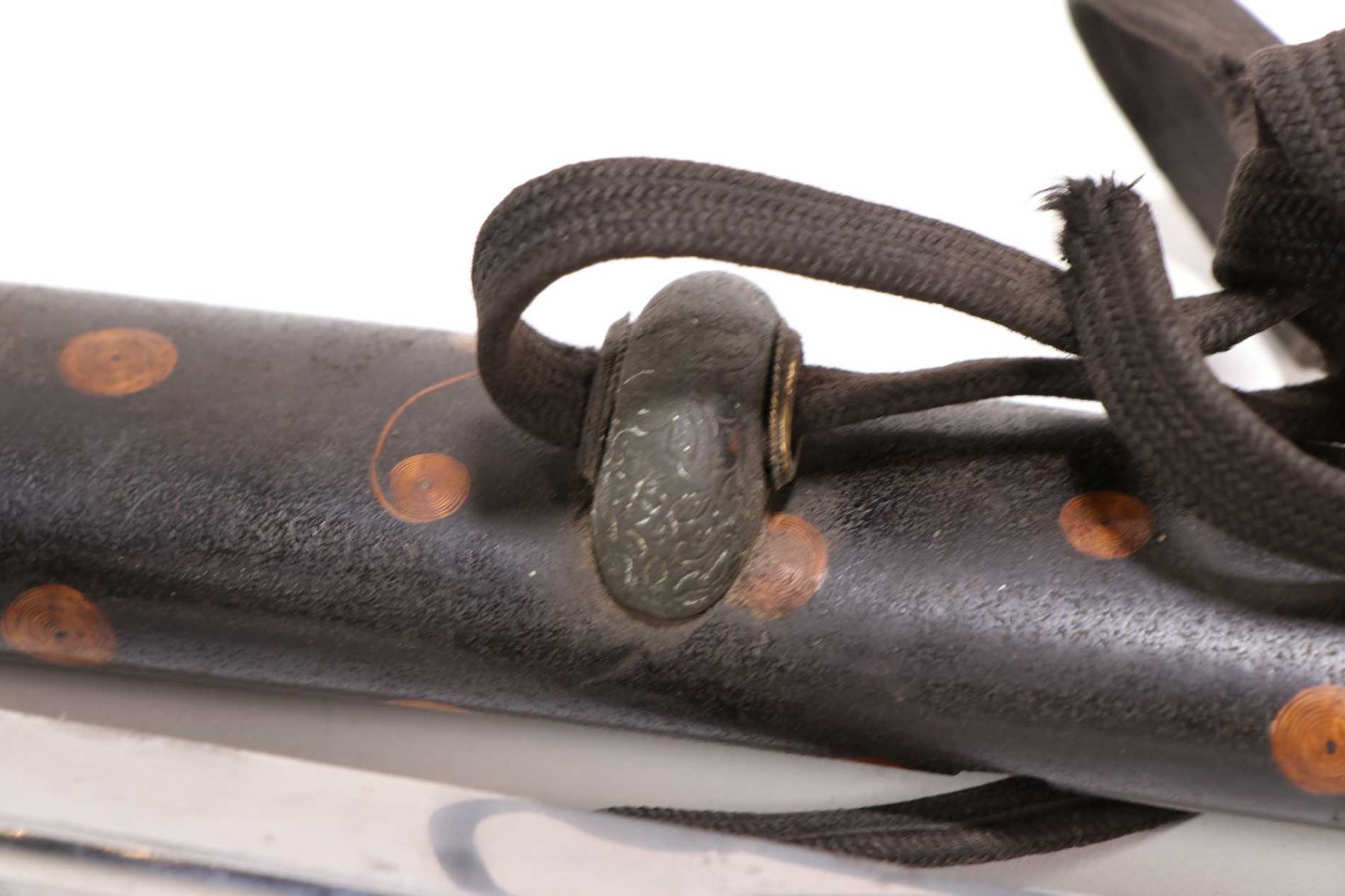 Japanese Wakizashi with 14" blade, note minor nicks to edge and faded tempered line, signature underneath original leather wrapped grip, metal guard with two spacers, wooden Saya with wrapped purportedly manta ray skin inlaid with bronze, some pieces missing and a silver end cap, plus a small companion knife