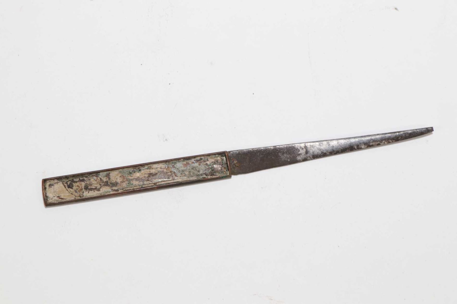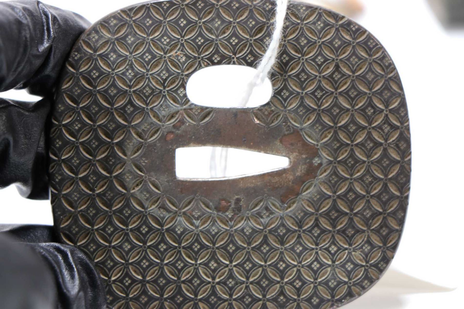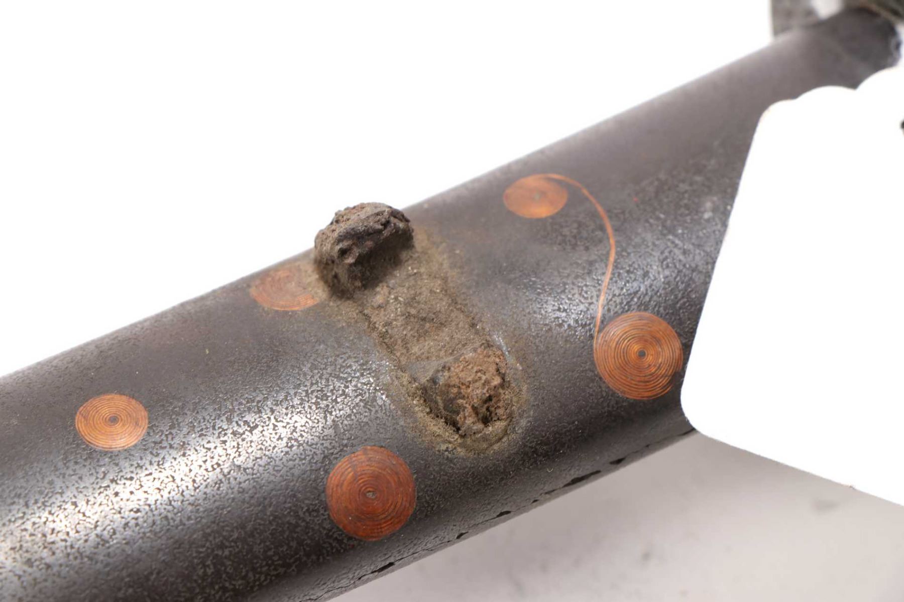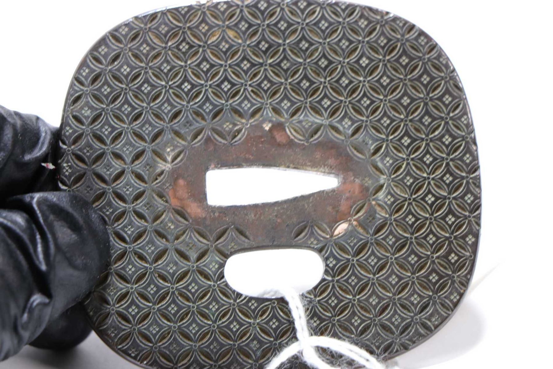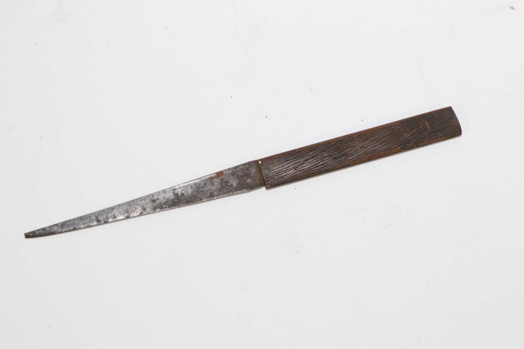 Japanese Wakizashi with 14" blade, note minor nicks to edge and faded tempered line, signature underneath original leather wrapped grip, metal guard with two spacers, wooden Saya with wrapped purportedly manta ray skin inlaid with bronze, some pieces missing and a silver end cap, plus a small companion knife