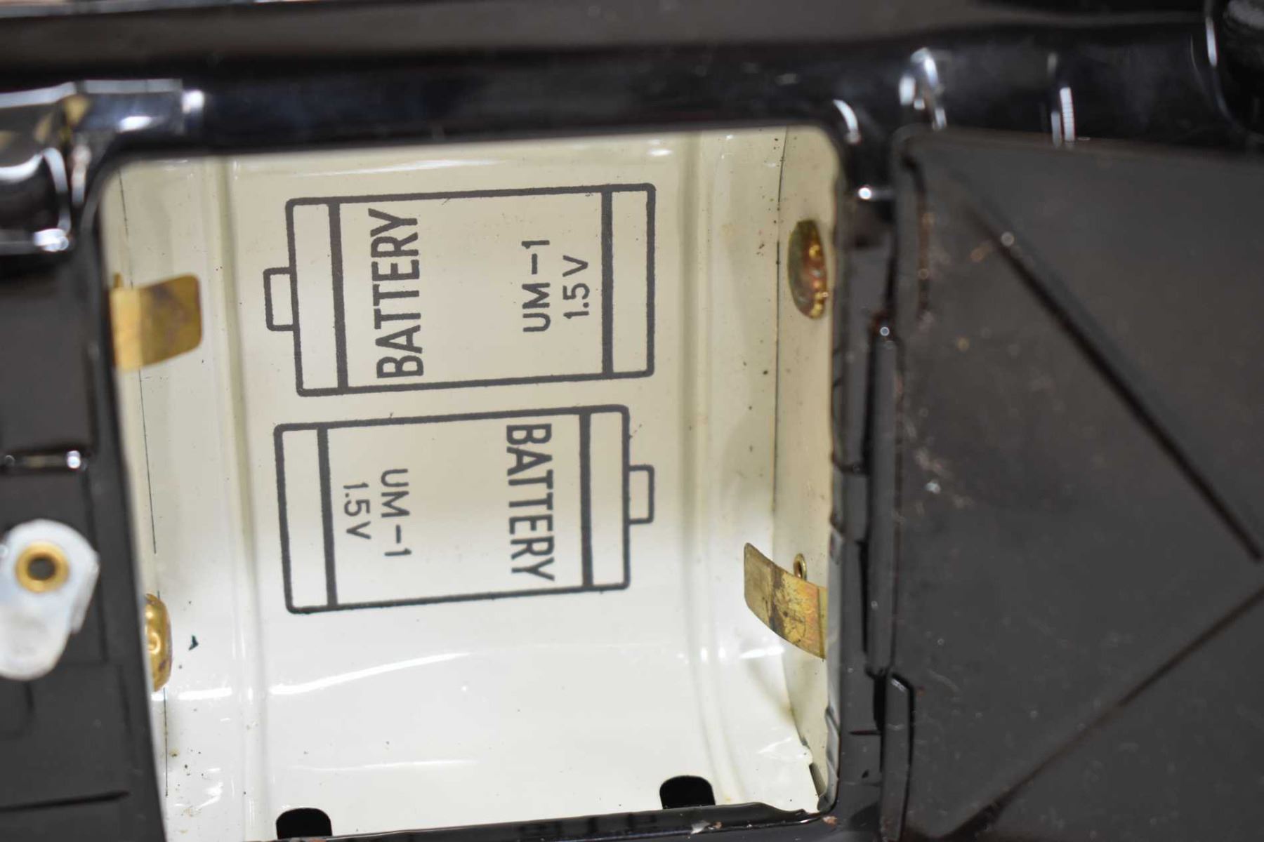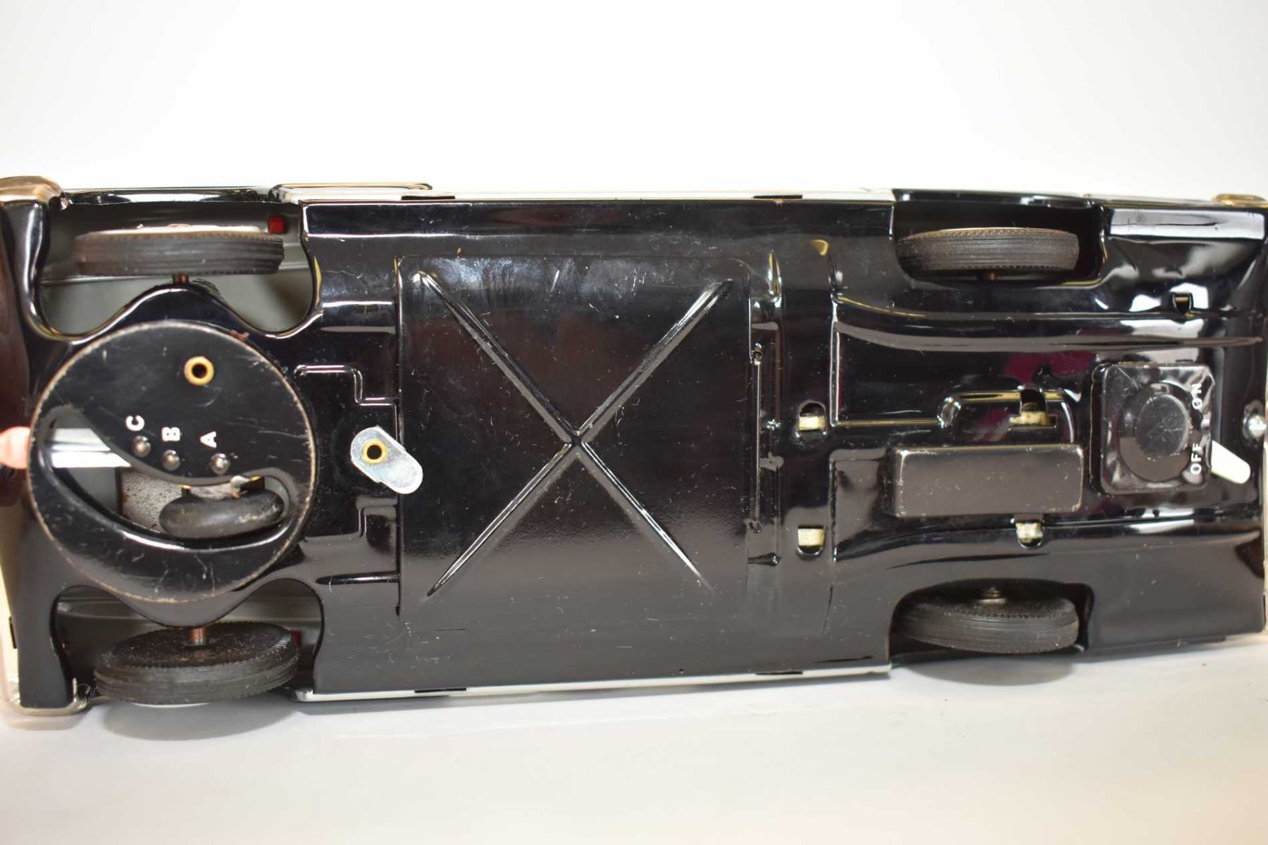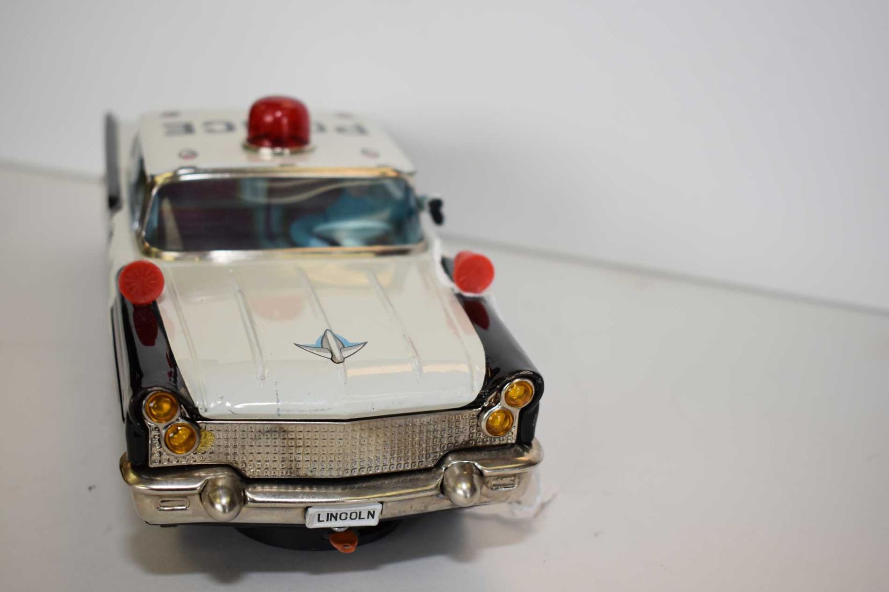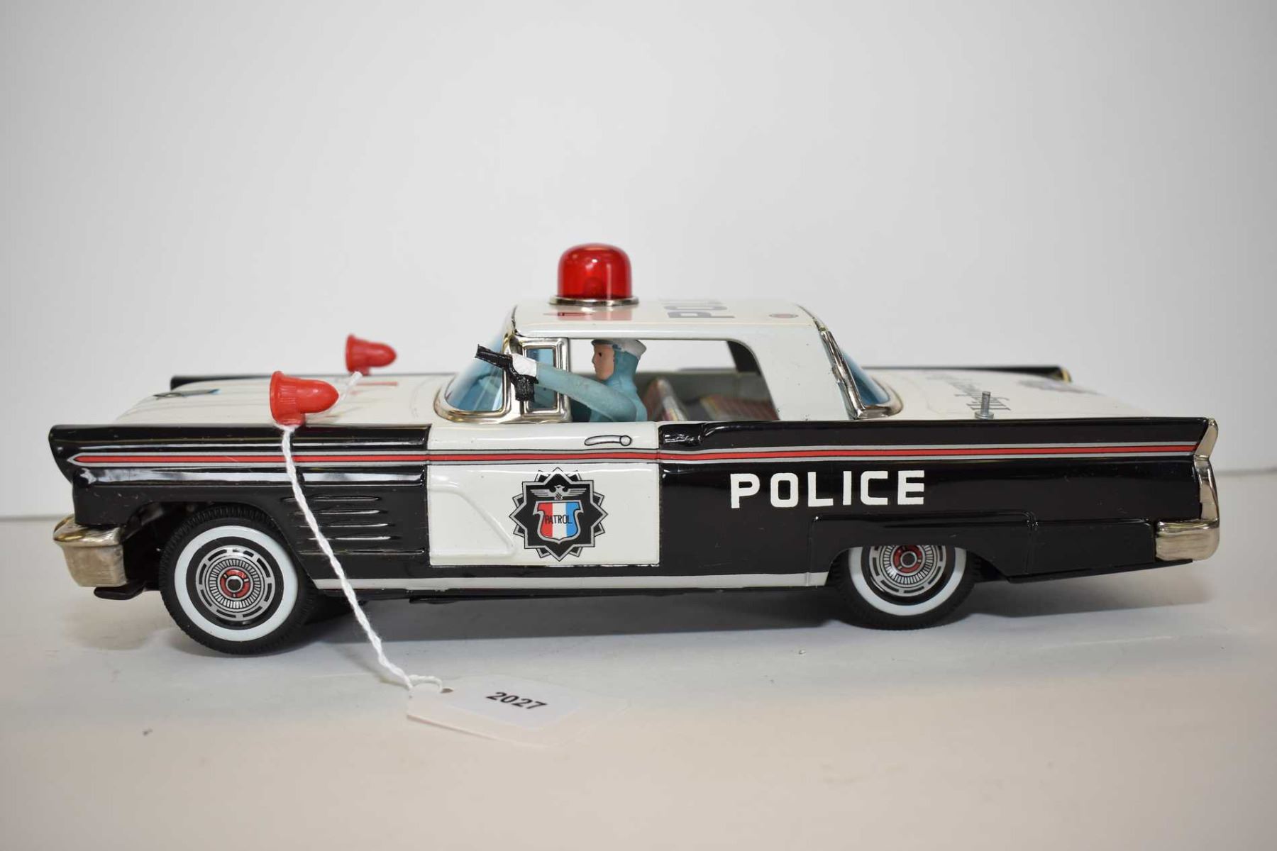 Japanese made pressed tin battery operated police car with shooting driver, in excellent all original condition, 11" in length