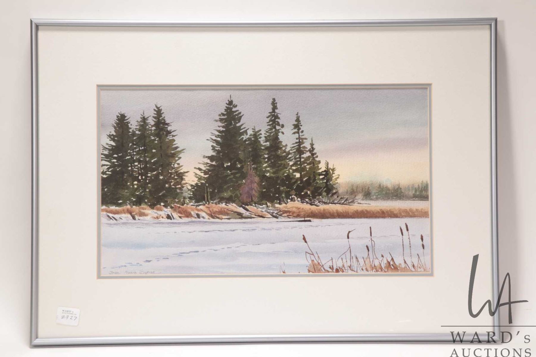 Jean Morie Zupan ( John M. Zupan 1941-1998) framed original watercolour painting of a winter treeline, 8 1/2" X 15"