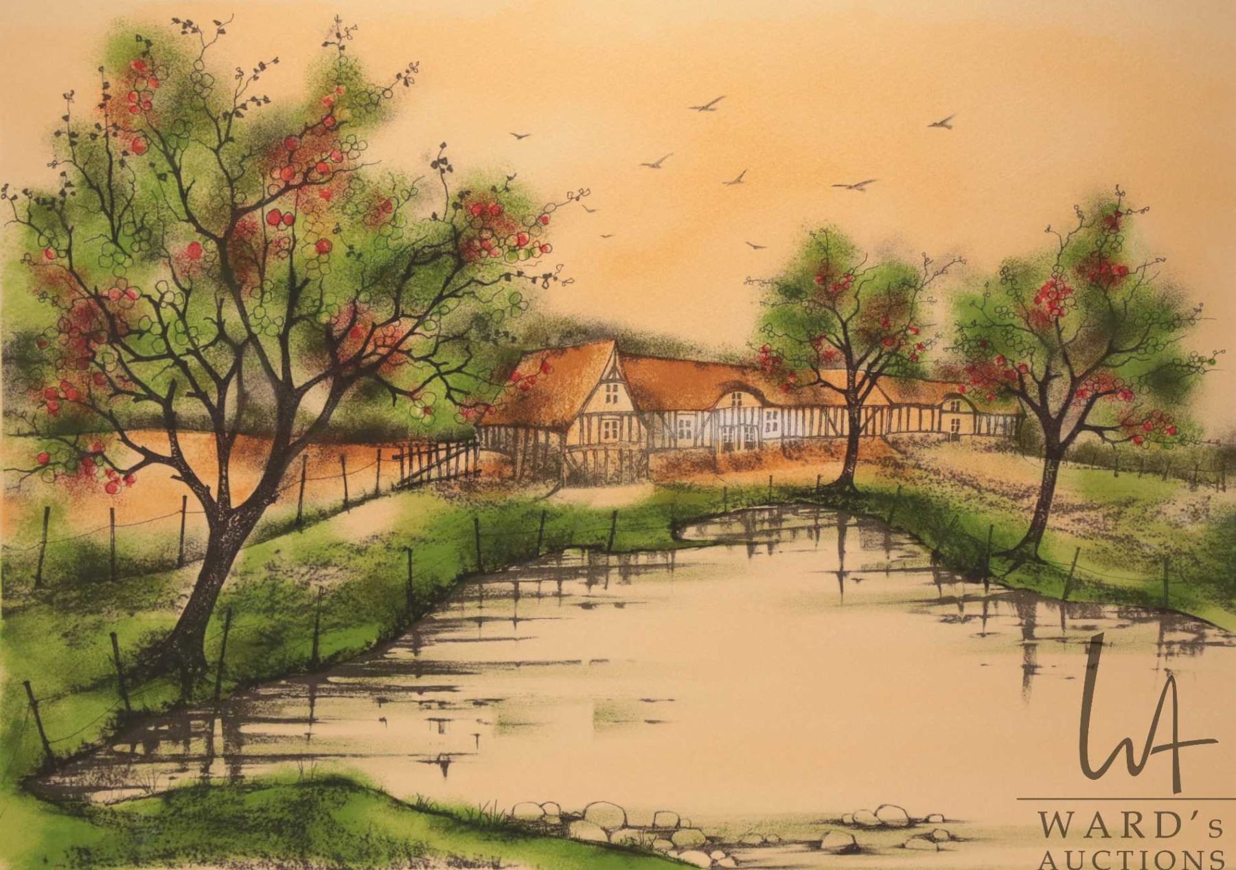 Jeanine Kostia Blancheteau limited edition print featuring a Tudor building and fruit trees, pencil