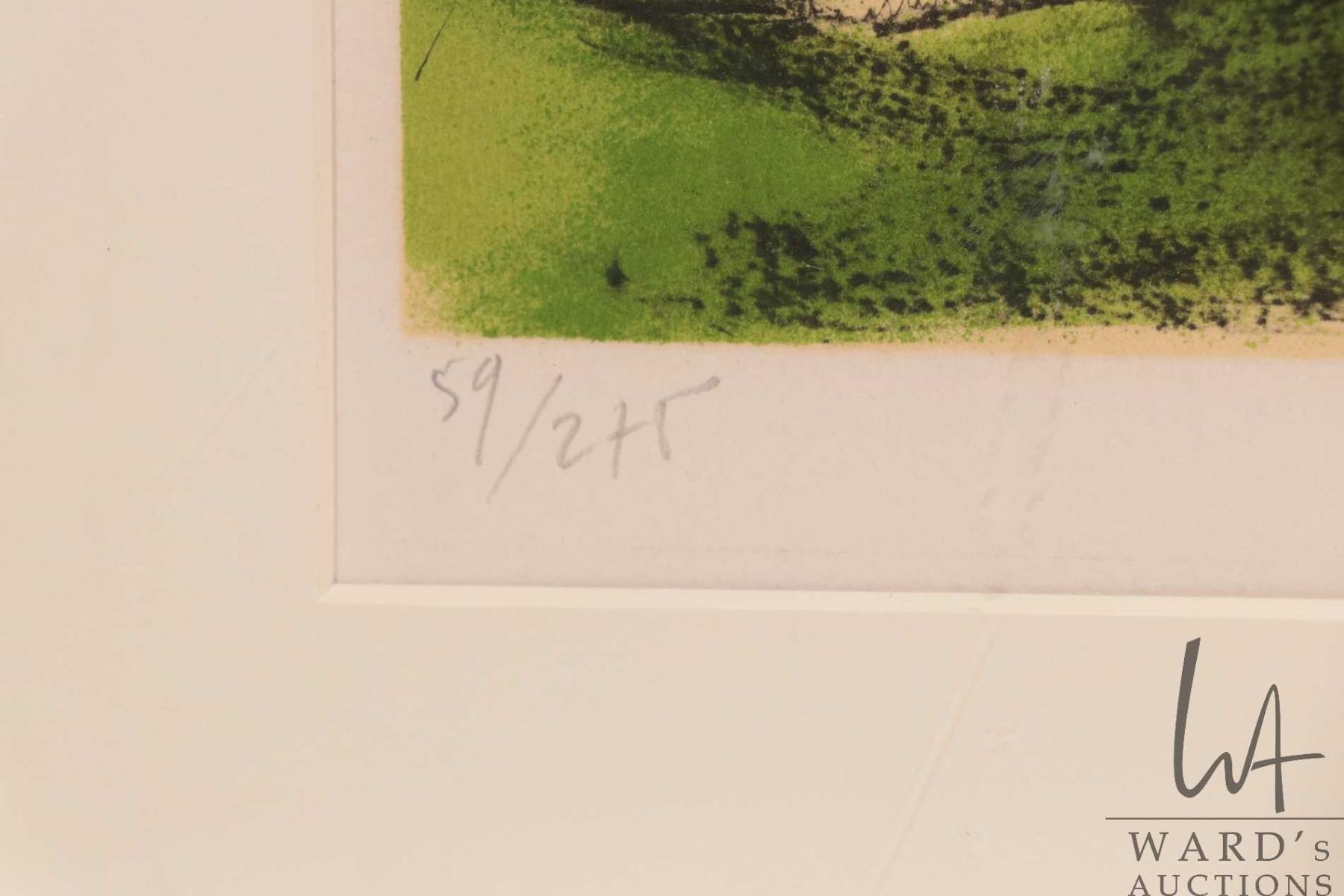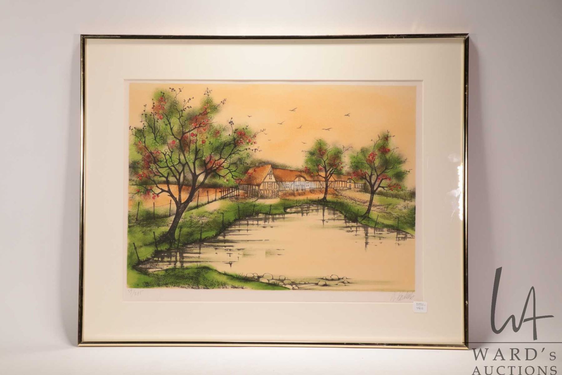 Jeanine Kostia Blancheteau limited edition print featuring a Tudor building and fruit trees, pencil signed by artist 58/ 275. Overall dimension including frame 22 1/2" X 28" . Note: This is too large to ship. Local pickup only