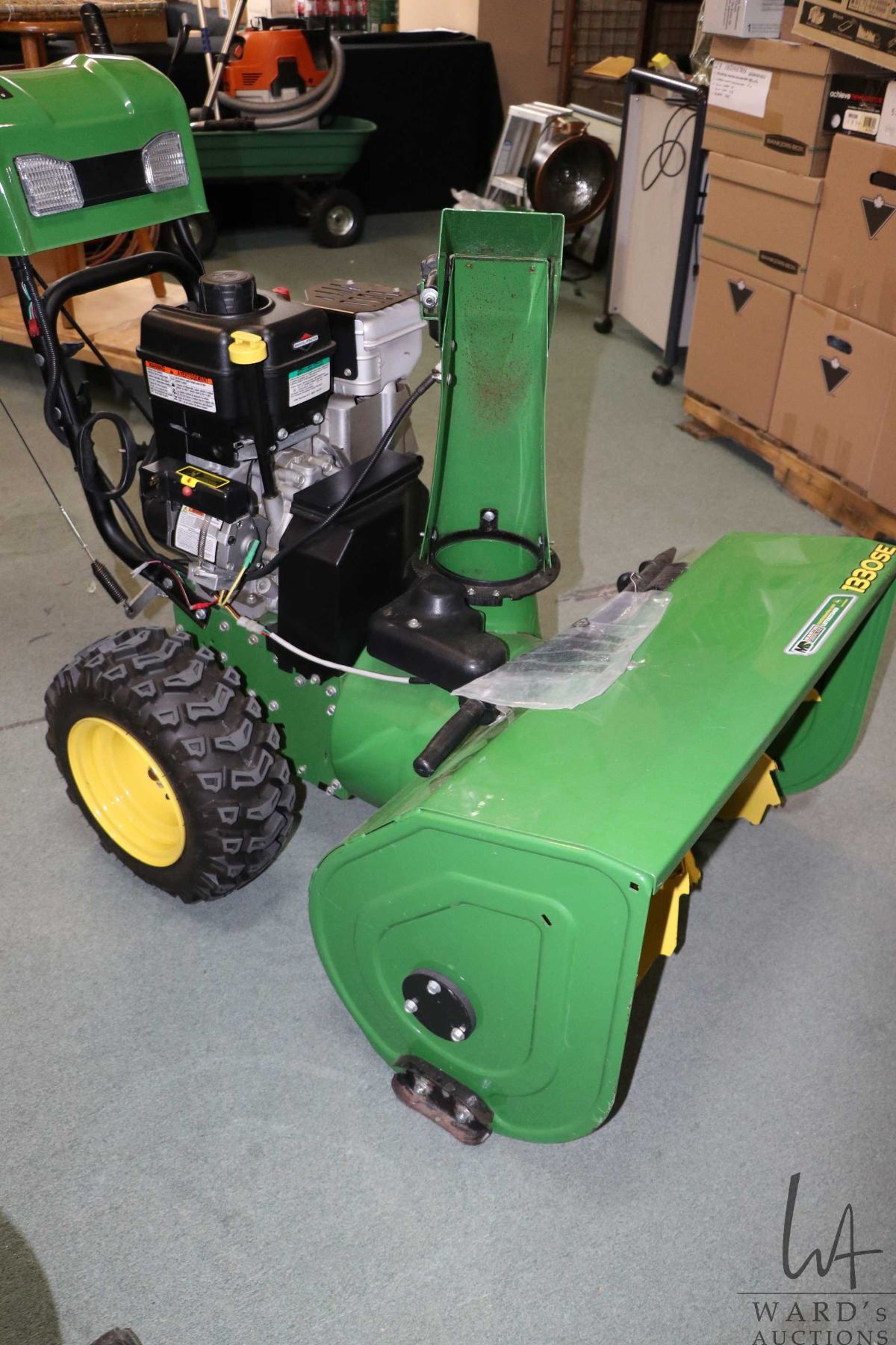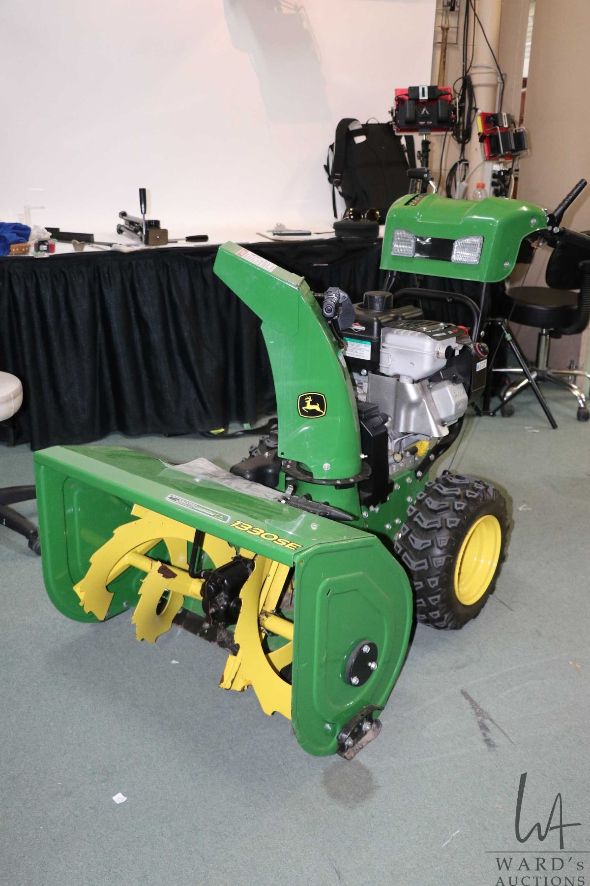 John Deere 1330SE gas powered snow blower and fuel can. Working at time of cataloging