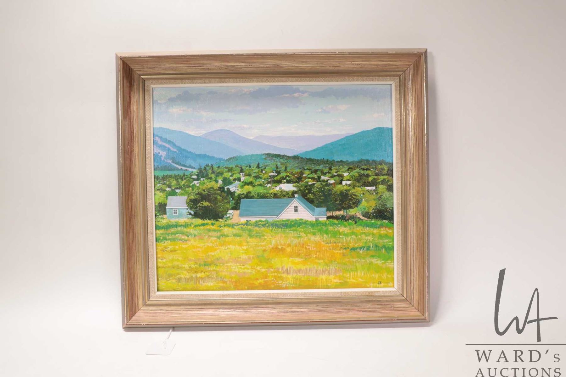 John M. Zupan (1941-1998) framed acrylic on canvas painting of roof tops in a valley, intialled by a