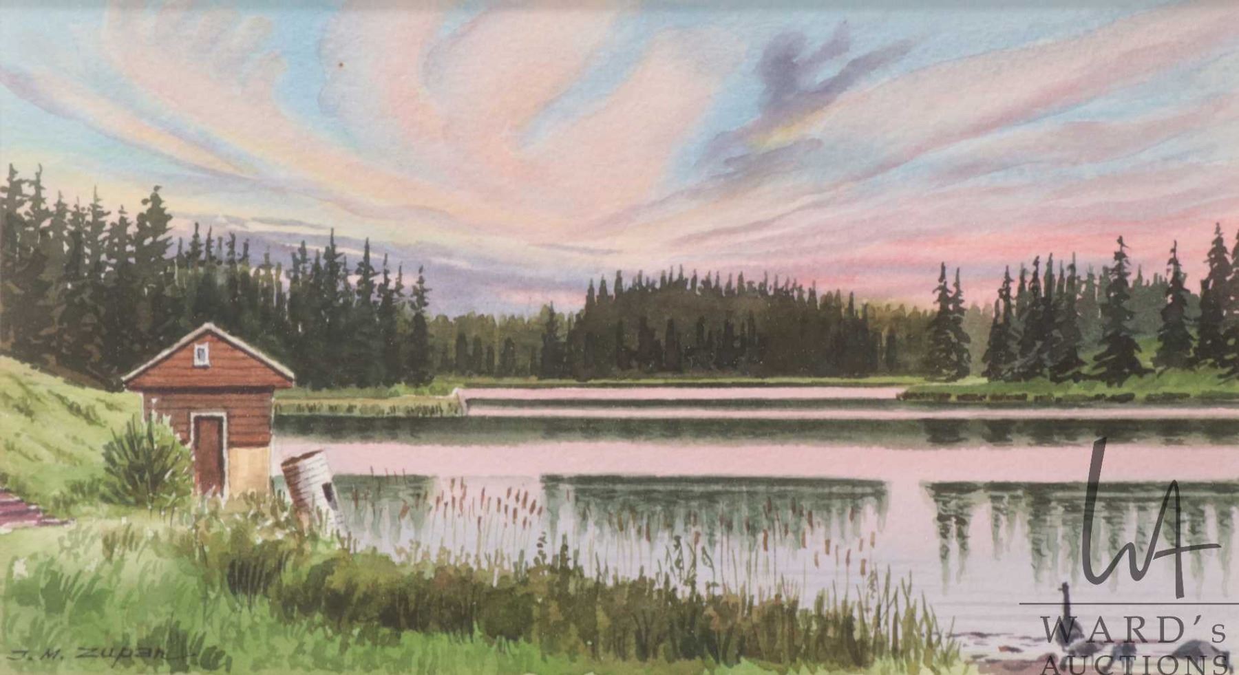 John M. Zupan (1941-1998) framed original watercolour painting, labelled on verso " Evening Solitude