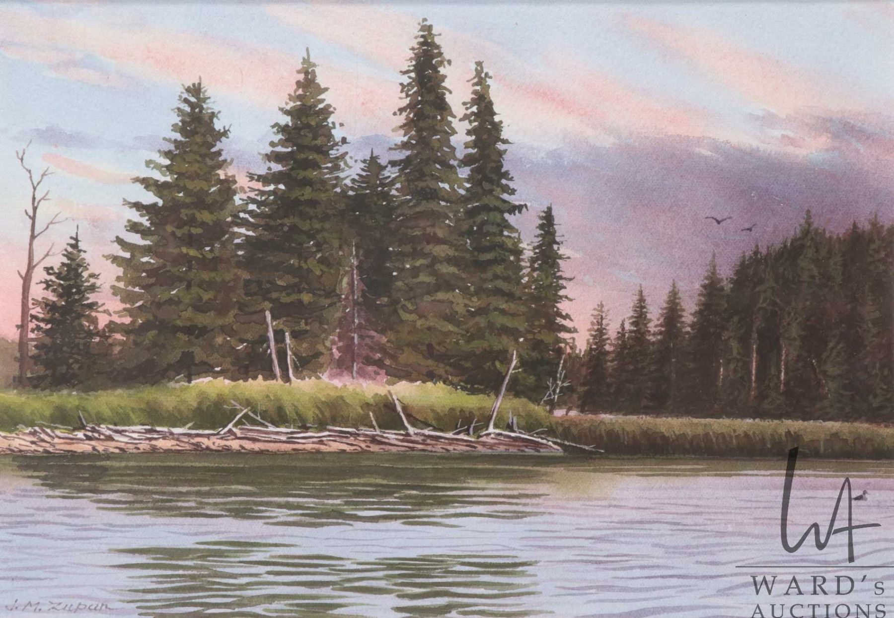 John M. Zupan (1941-1998) framed original watercolour painting of a shoreline lake, 7 1/2" X 10 1/2"