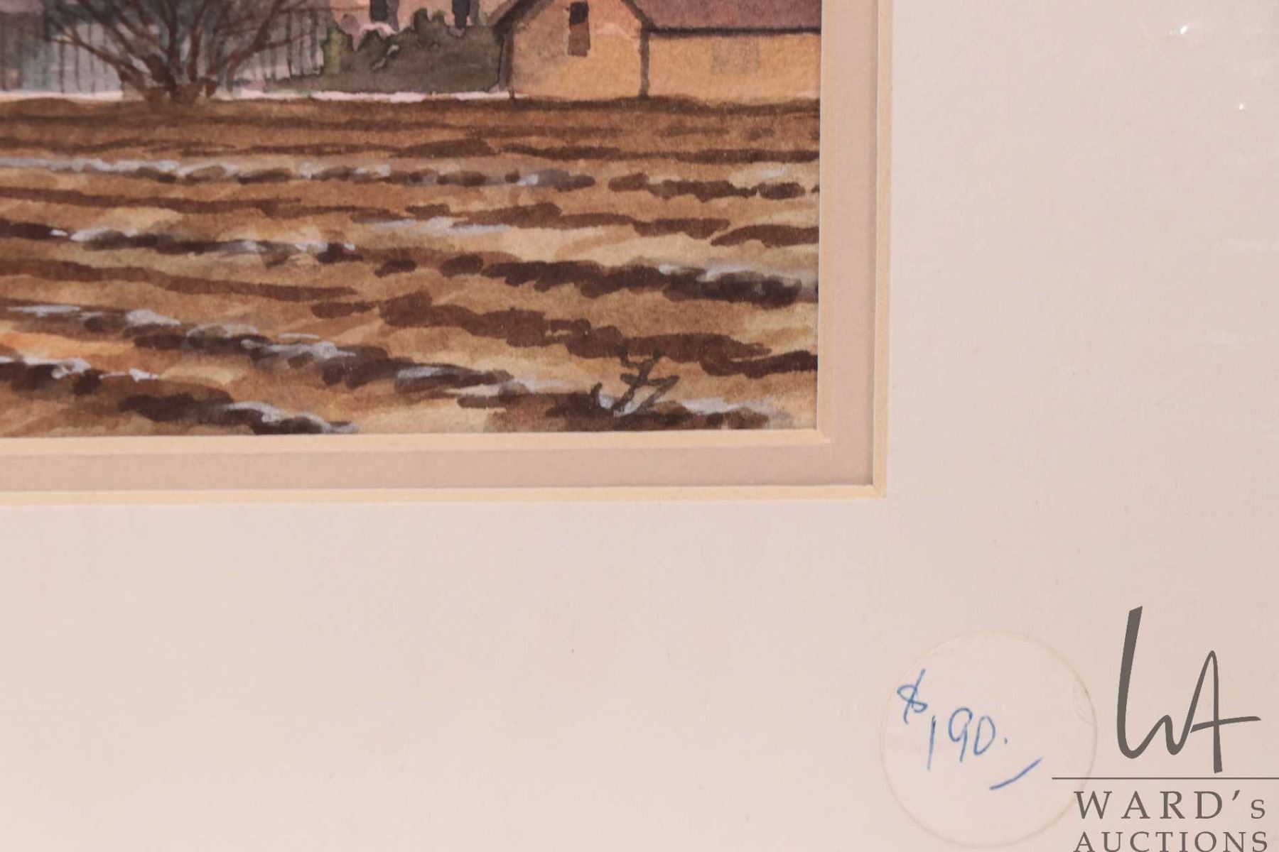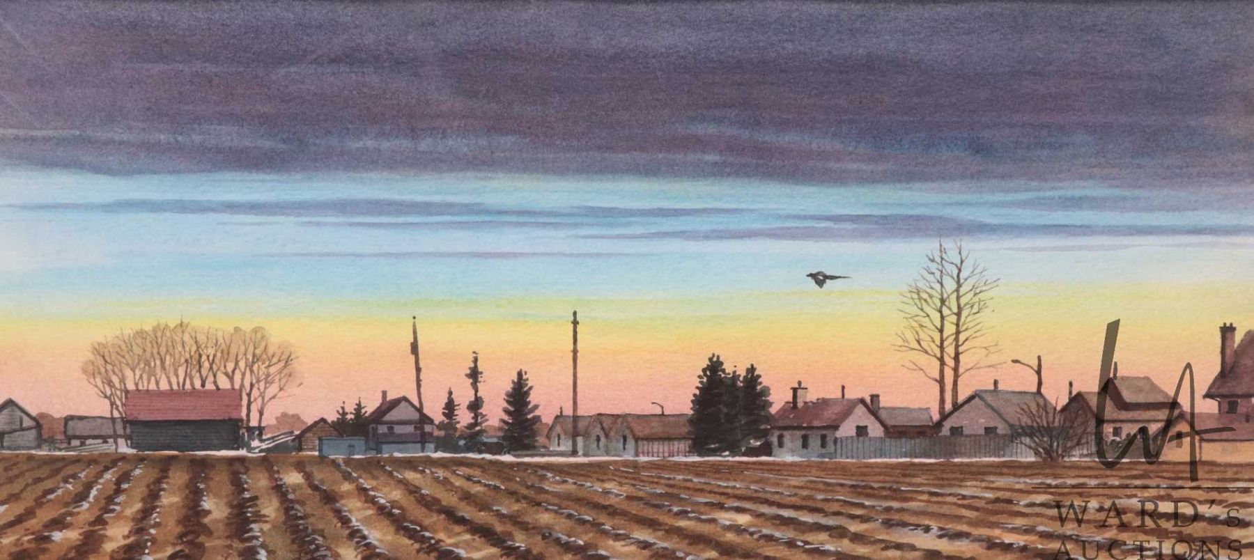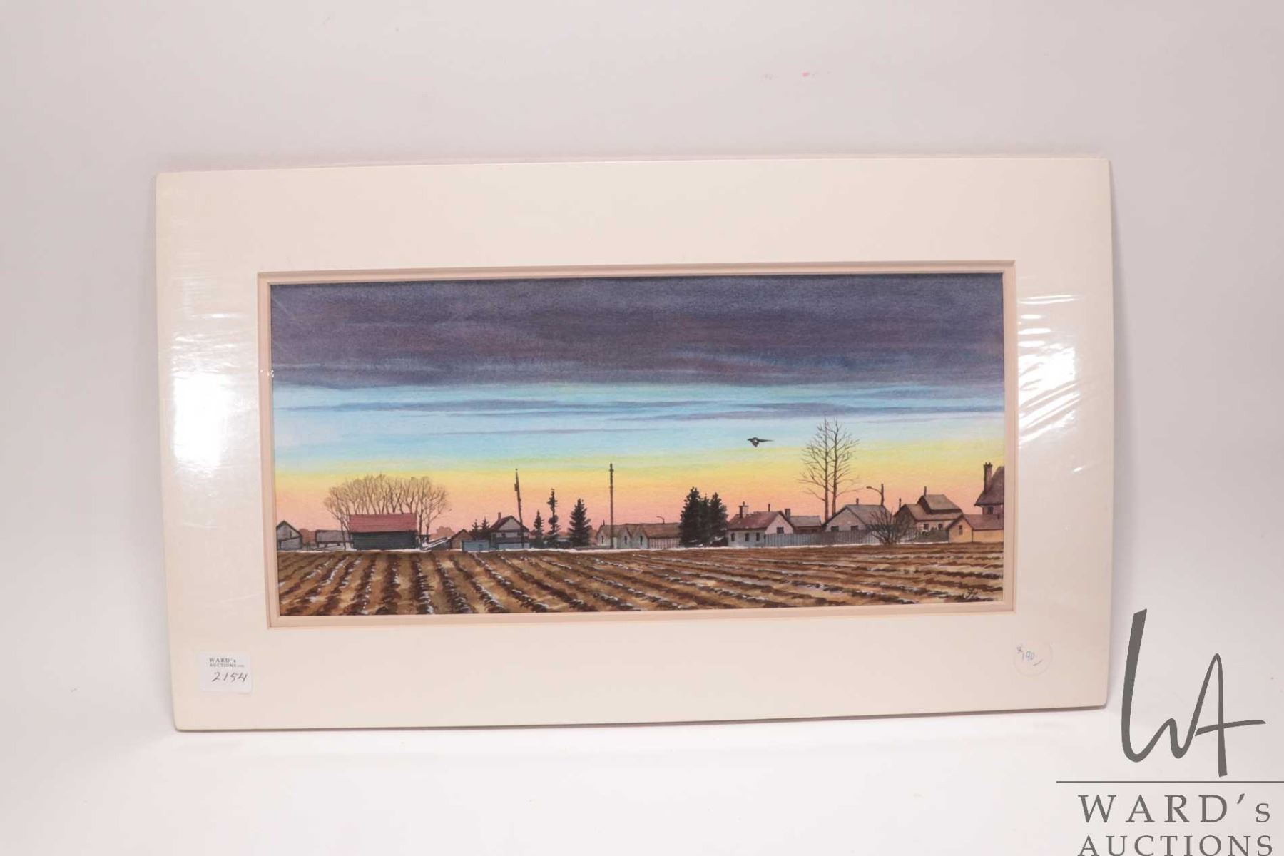 John M. Zupan (1941-1998) mat framed original watercolour painting, labelled on verso " Sunset at 167 Ave", 6" X 13"