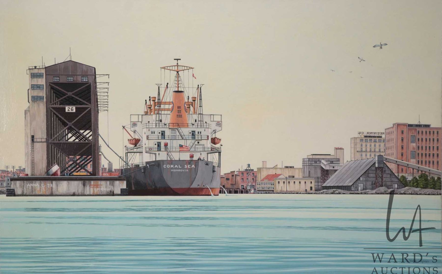John M. Zupan (1941-1998) unframed acrylic on board painting of the Coral Sea Monrovia ship in dock,