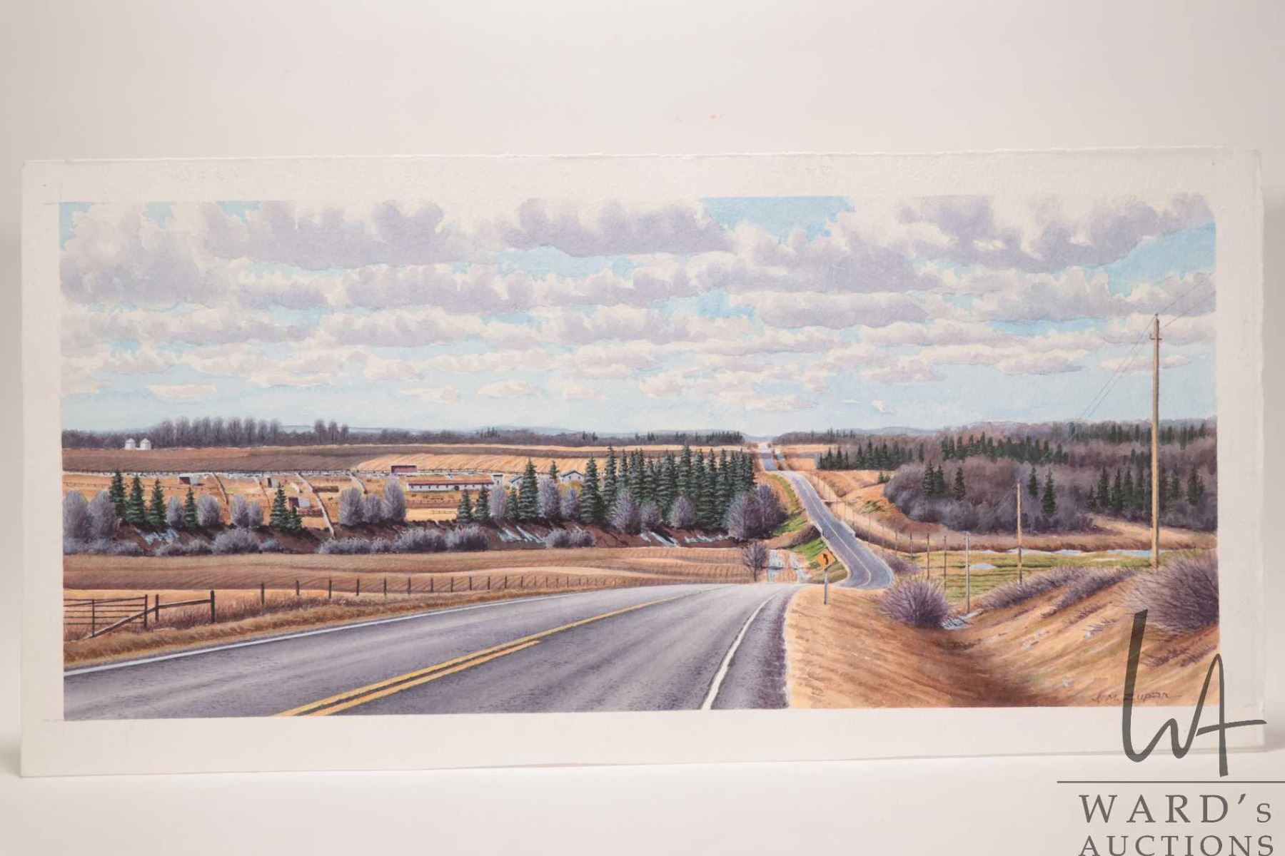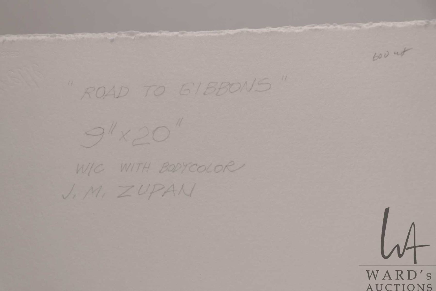 John M. Zupan (1941-1998) unframed original watercolour / body color painting, titled on verso " Road to Gibbons", 9" X 20"