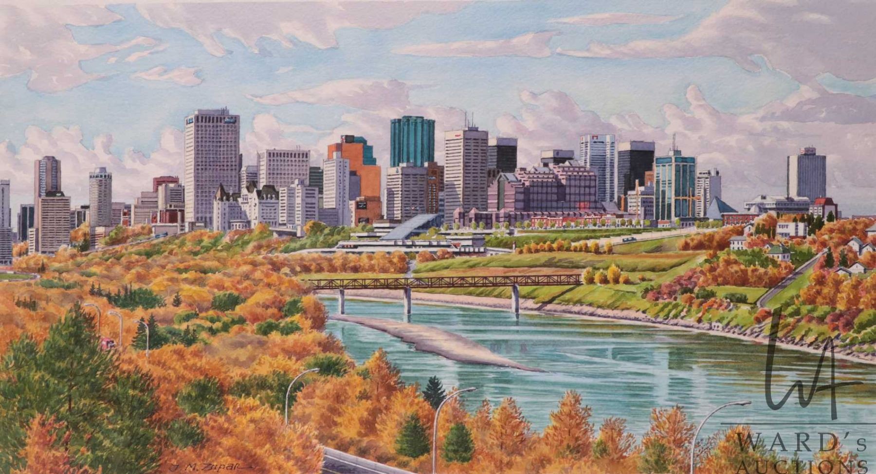John M. Zupan (1941-1998) unframed original watercolour painting, titled on verso " Downtown Edmonton in Fall", artist signed, 9" X 17 1/2"