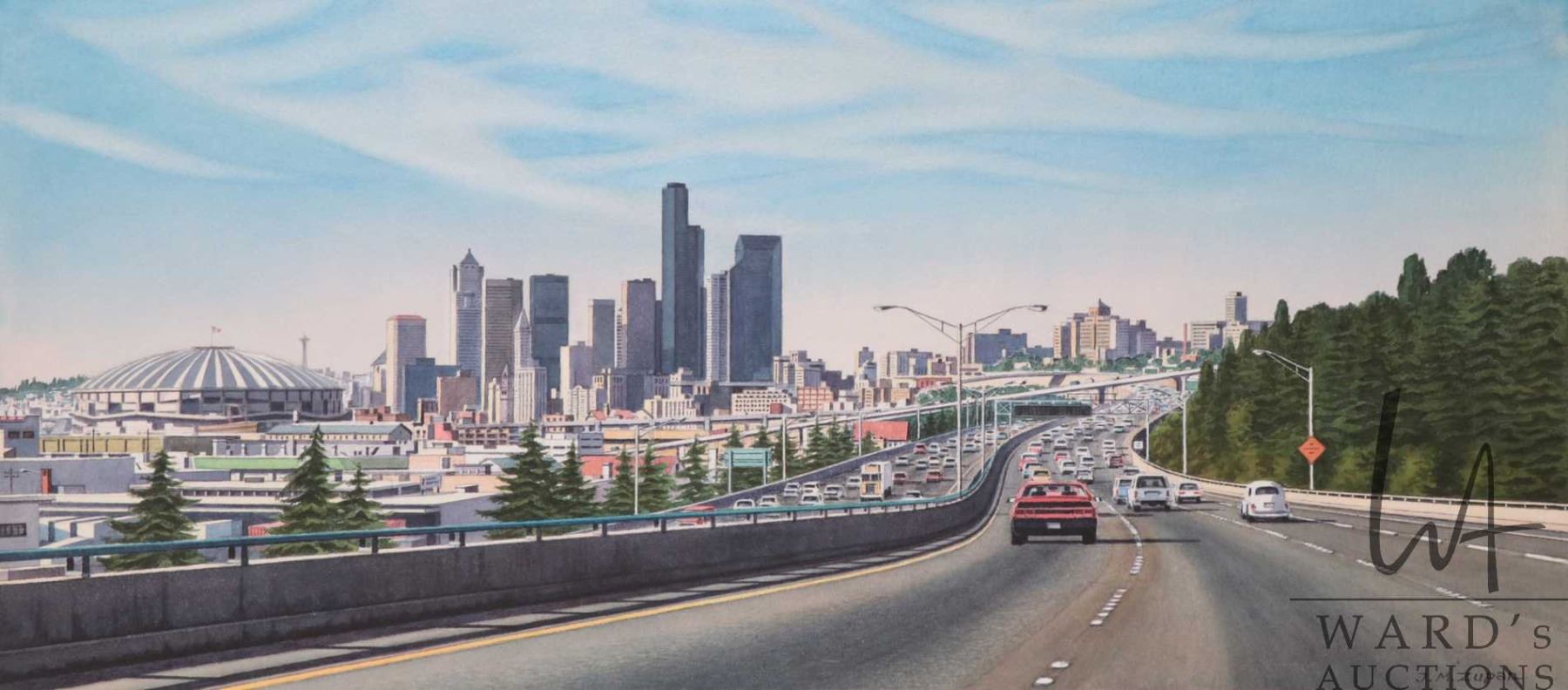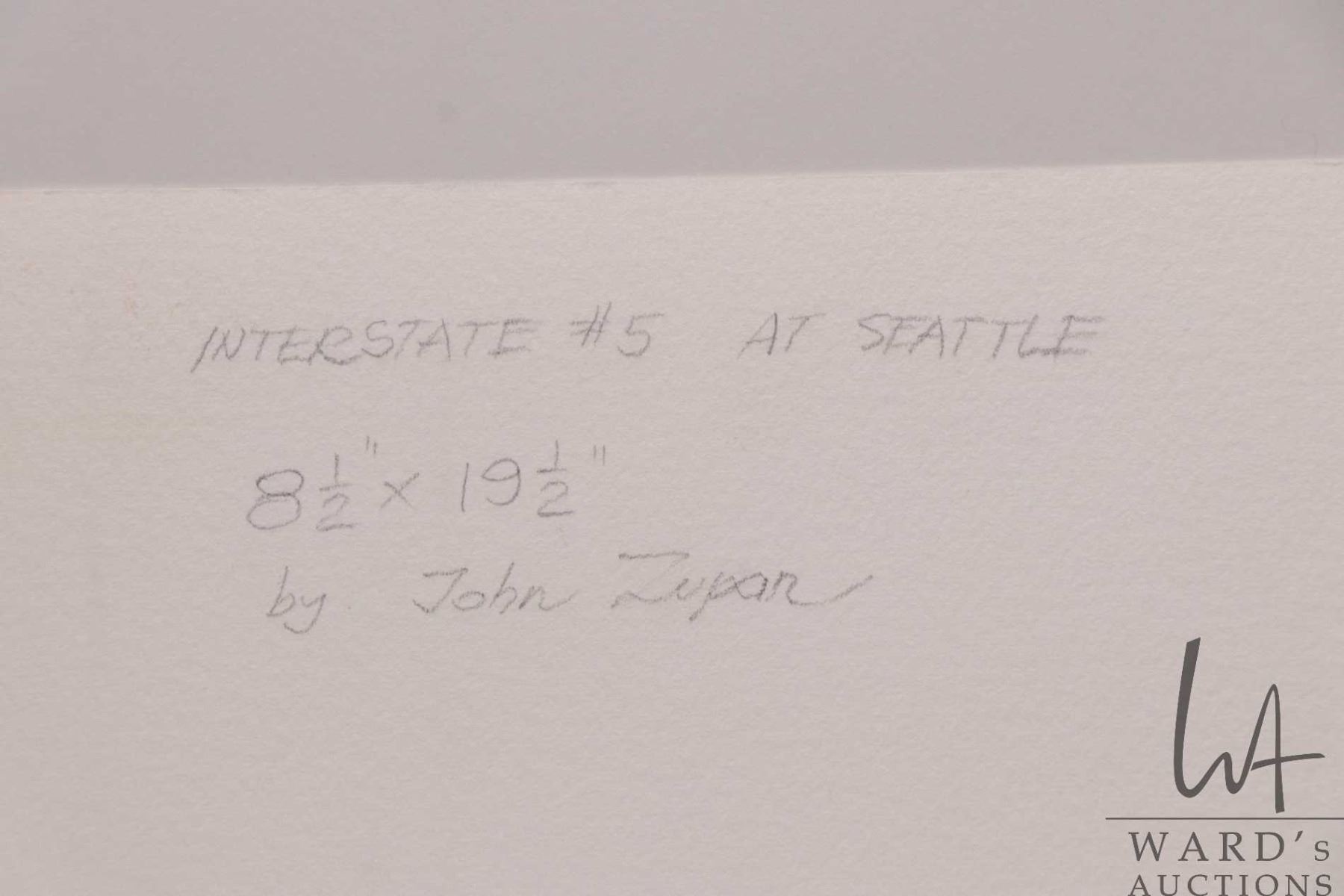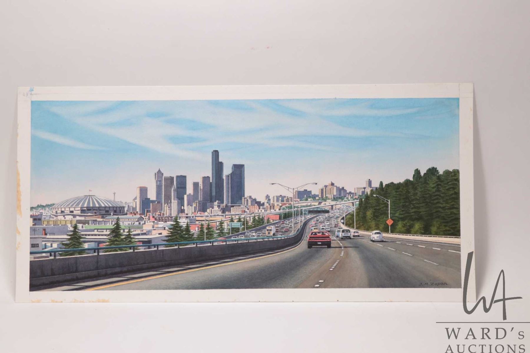 John M. Zupan (1941-1998) unframed original watercolour painting, titled on verso " Interstate #5 At Seattle", 8 1/2" X 19 1/2"