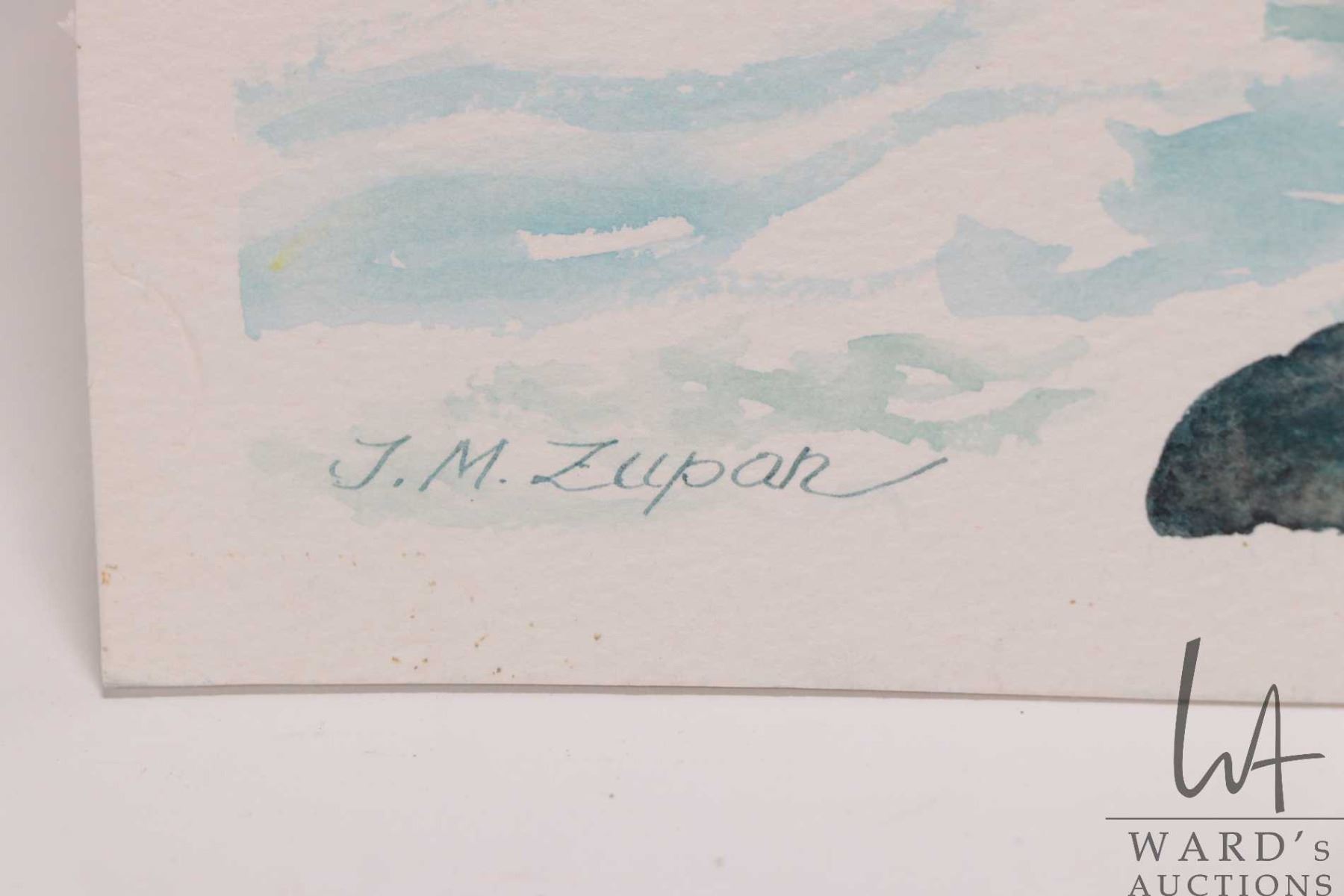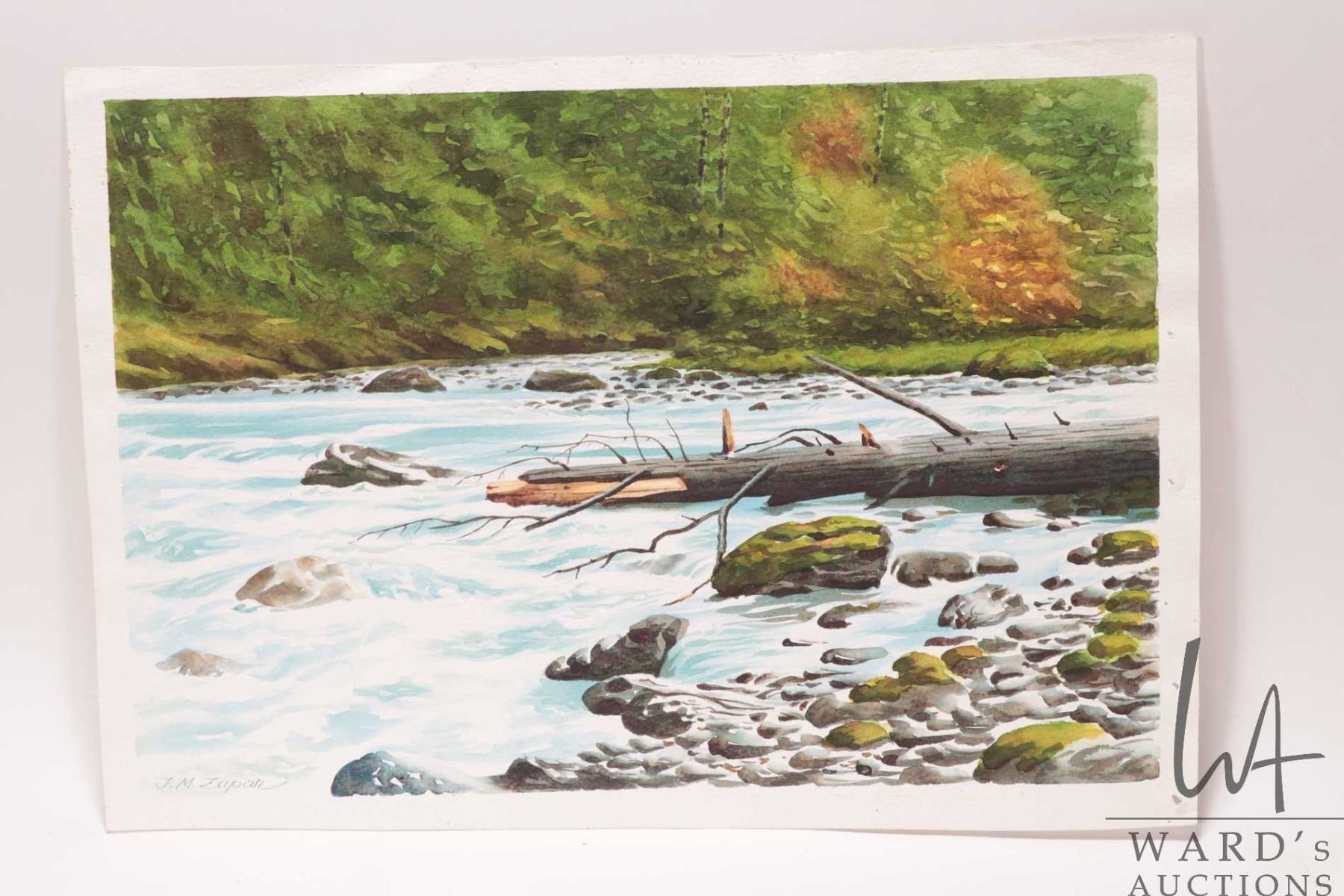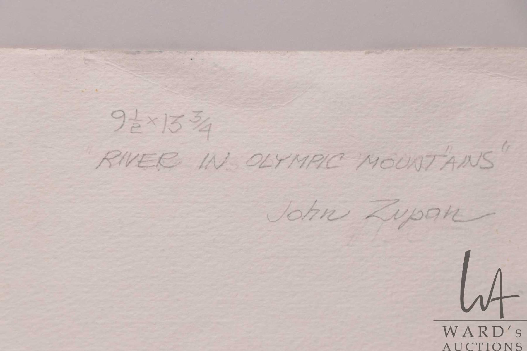 John M. Zupan (1941-1998) unframed original watercolour painting, titled on verso "River in Olympic Mountains" and signed by artist, 9 1/2 " X 13 3/4"