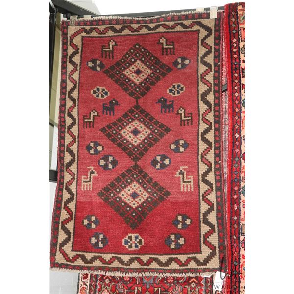 Small silk fringed carpet fitted with four rings on long edge for hanging, 31" X 20" Latest Update July 18, 2025 Bids Cannot be Withdraw...