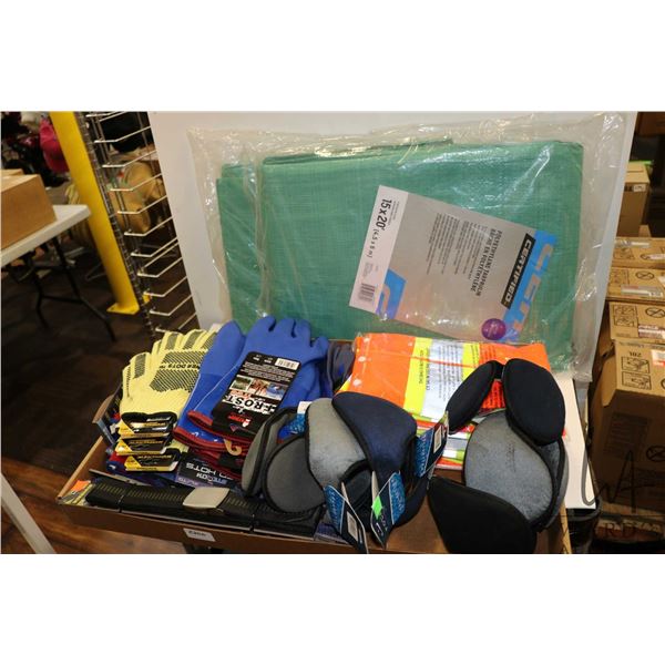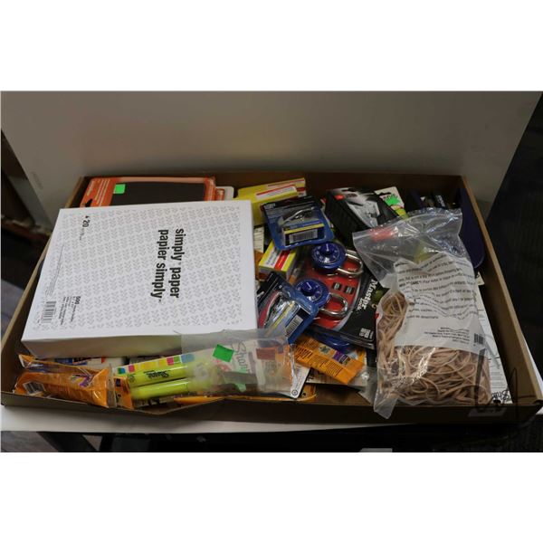 Selection of office supplies including copy paper, staplers, markers, pens, combination locks, white out, elastics, etc