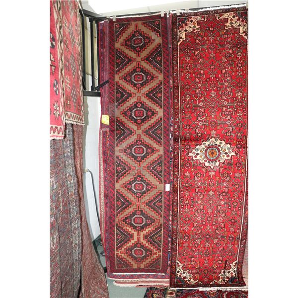 100% handmade Iranian wool carpet runner "Hamden" with geometric pattern, red background and highlights of green, orange and taupe etc. 41...