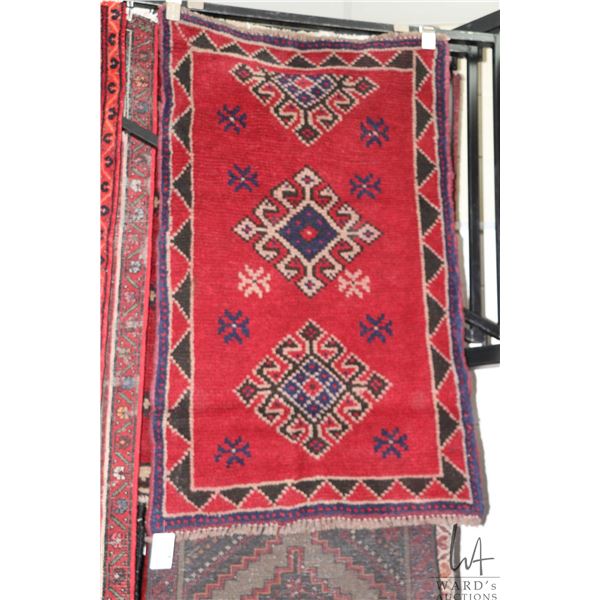 100% handmade Iranian wool throw carpet "Fasa" with triple medallion, red background, and highlights of brown, blue and taupe etc. 29"...