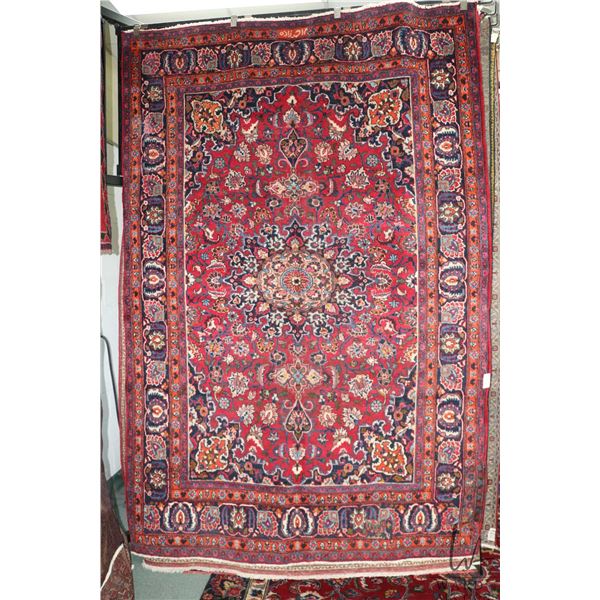 100% handmade Iranian wool carpet "Mashad" with center medallion, red background and overall floral