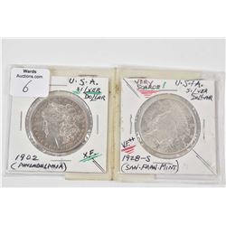 Two American silver dollars including 1902 from the Philadelphia mint and a scarce 1928 -S from the San Francisco mint
